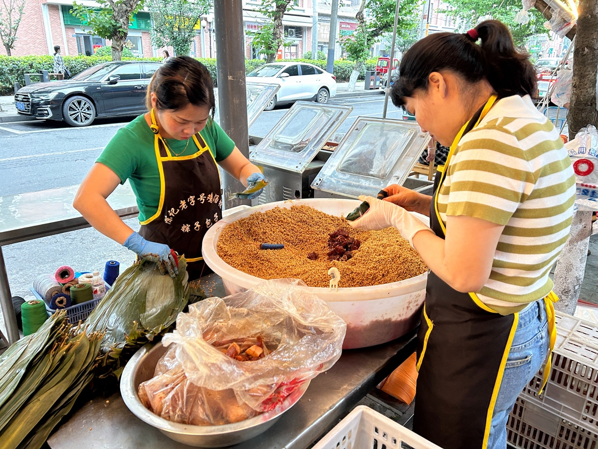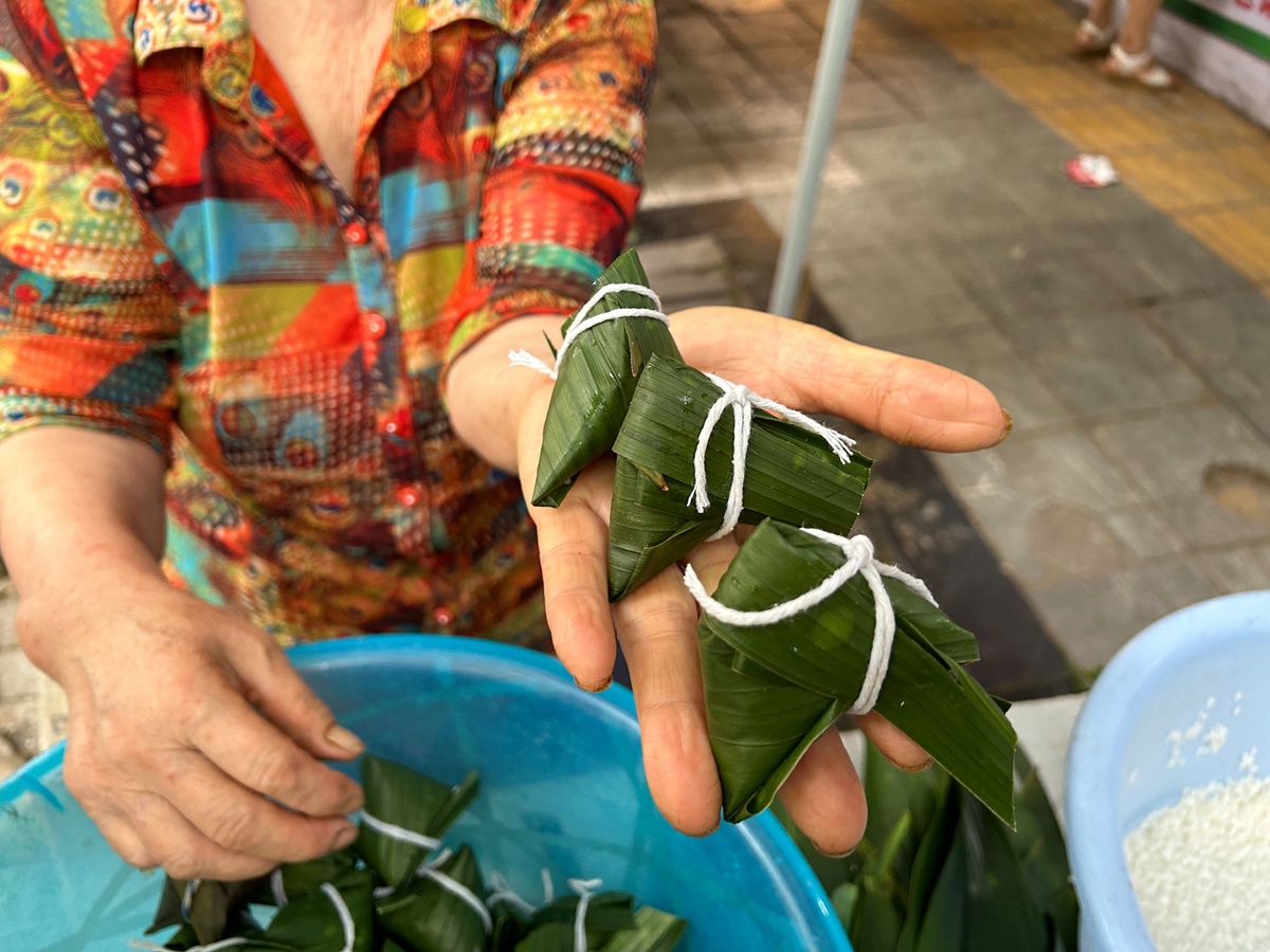 “粽子一条街”的摊位旁工作人员正在现场包粽子。武茹玉 摄