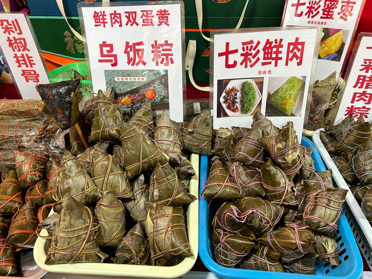 穿行在“粽子一条街”,记者发现,各大摊位的粽子不仅个头有大有小,甚至还有能随机开出红、绿、蓝、紫、黄、黑、白七种颜色的“盲盒”粽。“赵粽子”店铺工作人员崔秀珍介绍说:“这是我们推出的七彩花米粽,颜色是用蓝蝶花、洛神花、橙红木等植物染料上色的,‘开出’什么颜色,就看运气啦!”