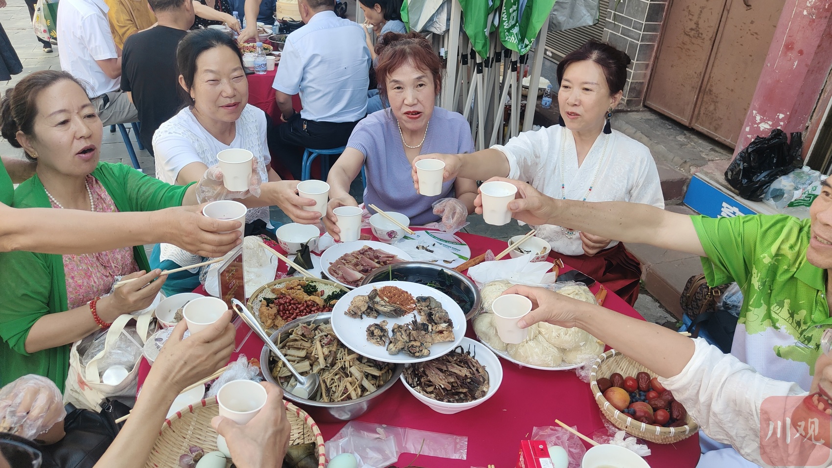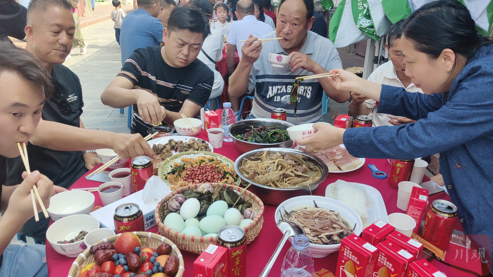 16时许,端午万人药根宴正式开宴。会理当地群众与各地游客举杯言笑,共同祈愿风调雨顺、五谷丰登、国泰民安,独属于国家历史文化名城——会理的端午烟火气弥漫在街头巷尾。
