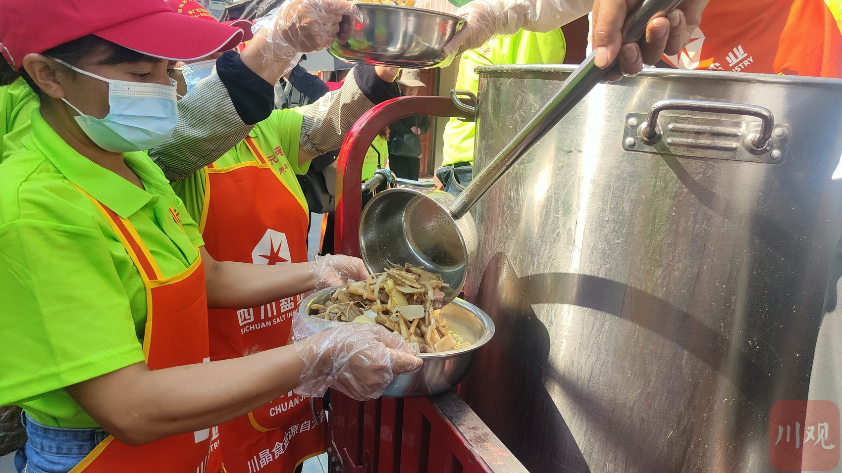 桌子正中央的药根汤就是万人宴的主角,药根汤配方是由会理名老中医根据会理的气候特点、饮食习惯等拟定的“三参两根一精”组方,里面有小白参、玉竹参、党参、牛蒡根、茴香根、黄精6味中药材,配合腊猪脚、土鸡一同炖煮,皆俱口感和营养。端午节吃药根汤,在滋补身体的同时,还可以清热排毒,驱邪顺气。