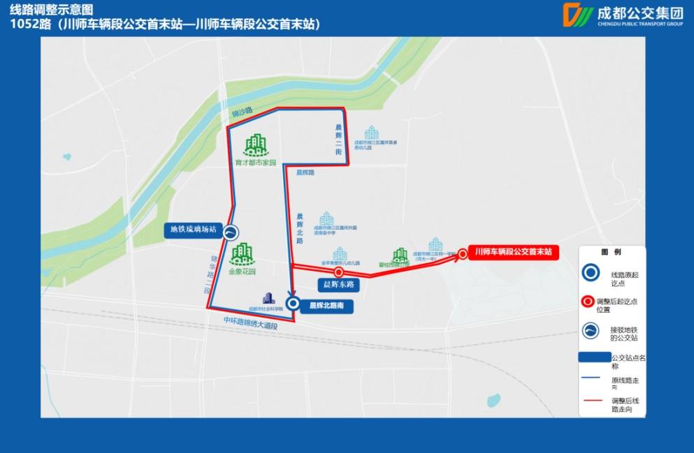 为加强晨辉东路与中环路干线联系,提升周边居民出行效率,拟调整1052路至川师车辆段公交首末站。