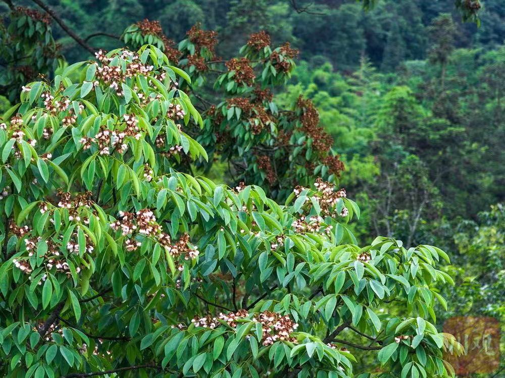 “这棵红豆树之前都零星开些花,但像今年这样全树都开花,确实很难得一见。”村民许隆毅站在树下说道。6月13日,报道组爬坡到海拔1000米的雅安市雨城区碧峰峡镇后盐村,这里有棵树龄约2700年的红豆树,树下铺撒着蝴蝶形的乳白色小花,还散发着淡淡的红豆香气。