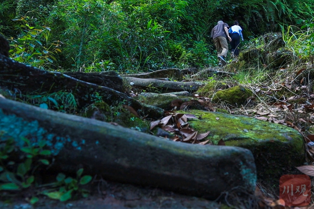 连接这些古民居的道路中,有一段被称为“高石梯”。高石梯是后盐村连接中里场、芦山县的主要通道,石梯面向蒙顶山茶园,沿红豆谷底登上梯顶共1791步台阶,行走1.5公里即可到达雅上线中里段,为雨城茶马古道的重要支线,同时也留下了卓越的红军战斗故事。张丰盈介绍,1935年11月,红军一路追击敌军来到后盐村,该军先锋张开基率队利用高石梯的独特地理位置,智取此地无人伤亡,击毙敌军七十多名。这一漂亮的战绩,也成为当地居民口耳相传的红色故事。