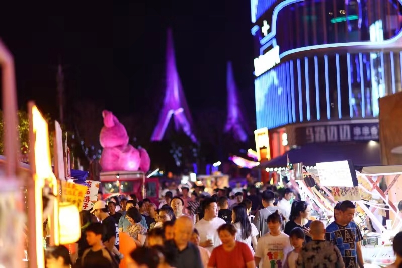 6月14日晚,明亮的街灯映衬下,绵阳经开区一号桥桥头亮如白昼,以“快乐多巴胺”为主题的城南VV市集成了年轻人的欢乐海洋与快乐集聚地……文创饰品、特色小吃、微醺营地以及街头篮球赛等备受青年人喜欢的项目,让沉寂多年的商区在欢声笑语中焕发出新的生机。