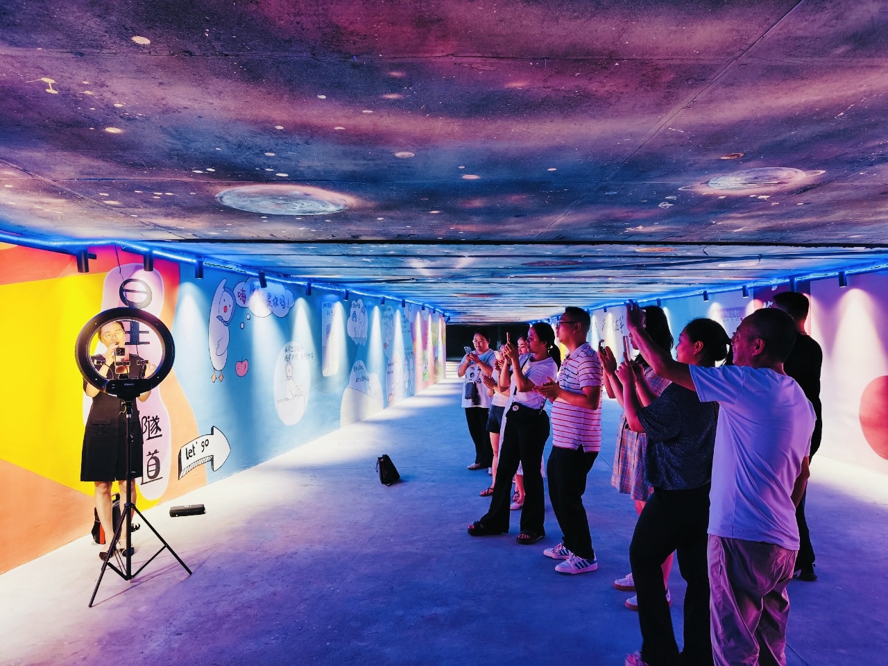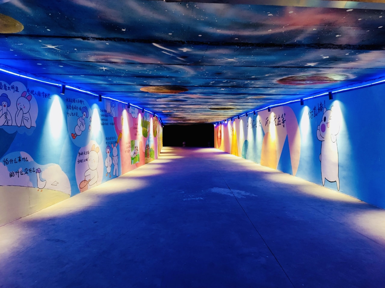 长约50米、三面墙体约500平方米的彩绘和近60余米的灯光改造让昔日阴冷、黑暗的过街桥洞变身绵阳“最美桥洞”。据了解,后续该桥洞两边尽头延展处将布置更加美化的装饰并配备座椅等公共设施。