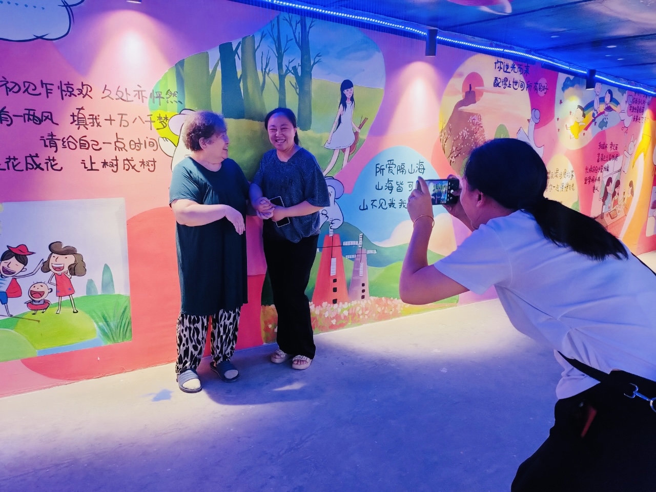 6月12日晚,改造后的绵阳市游仙区涪江街道韩家脊社区三汇绿岛下穿桥洞“星光璀璨”,顶部彩绘的“宇宙星空”,两边墙壁的大鹅、兔子、人像及俏皮的卡通漫画等形象吸引了众多市民和网红前来打卡。