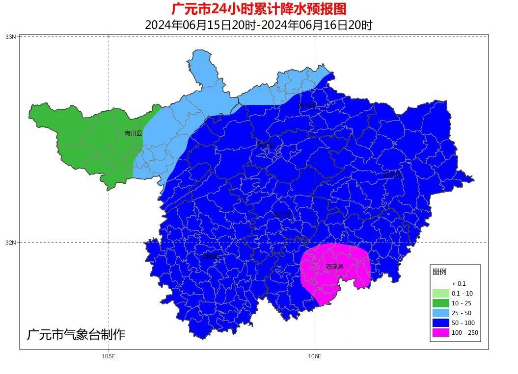 未来24小时,广元大部有大到暴雨,局部地区大暴雨。6月15日下午,广元市发布暴雨蓝色预警、地质灾害气象风险黄色预警,山洪灾害蓝色、黄色预警。
