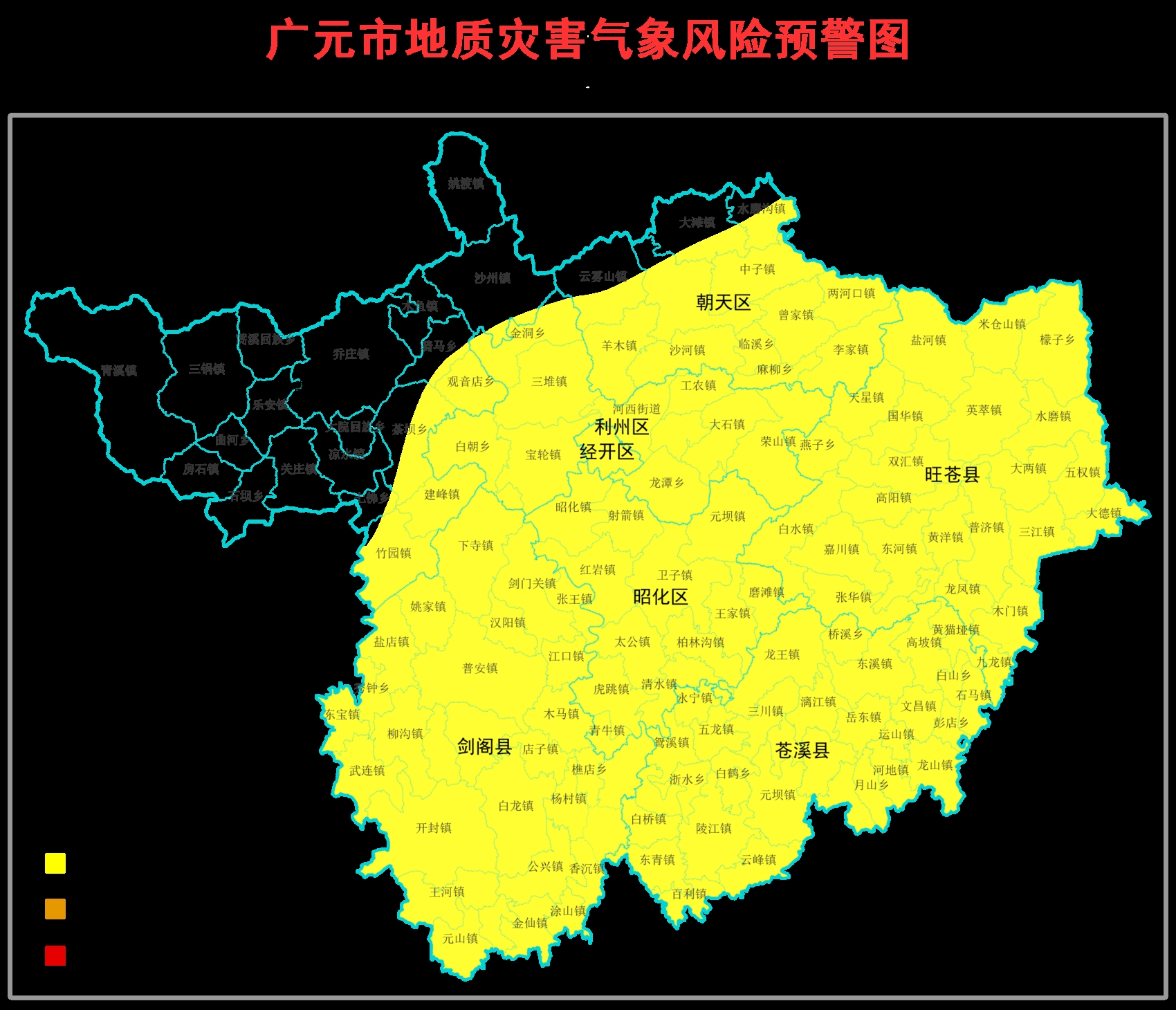 广元市地质灾害指挥部办公室同步发布地质灾害气象风险黄色预警,预警范围为:苍溪县、旺苍县、剑阁县、利州区(含经开区)、昭化区、朝天区全境,青川县竹园镇、沙州镇、建峰镇、茶坝乡、七佛乡、骑马乡、观音店乡等7个县(区)129个乡镇。