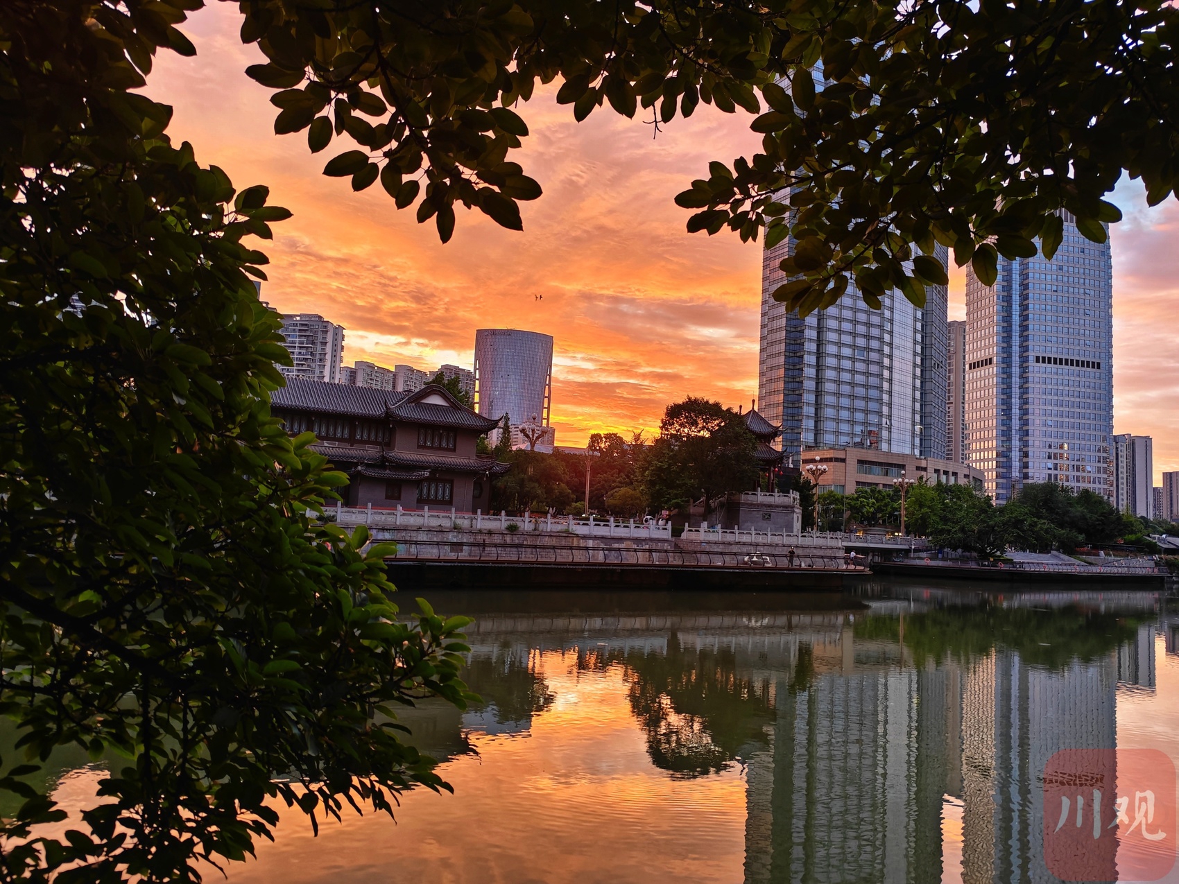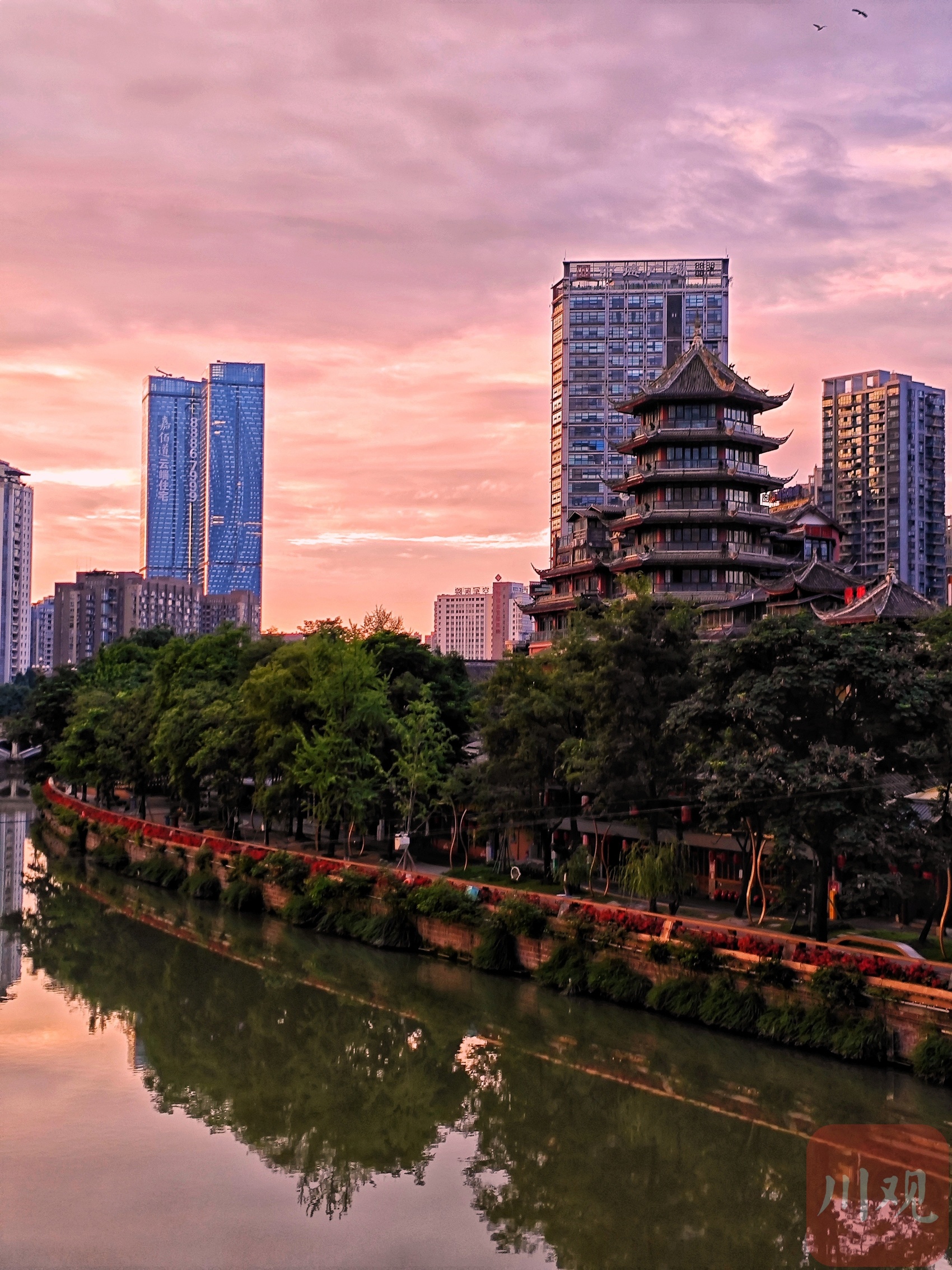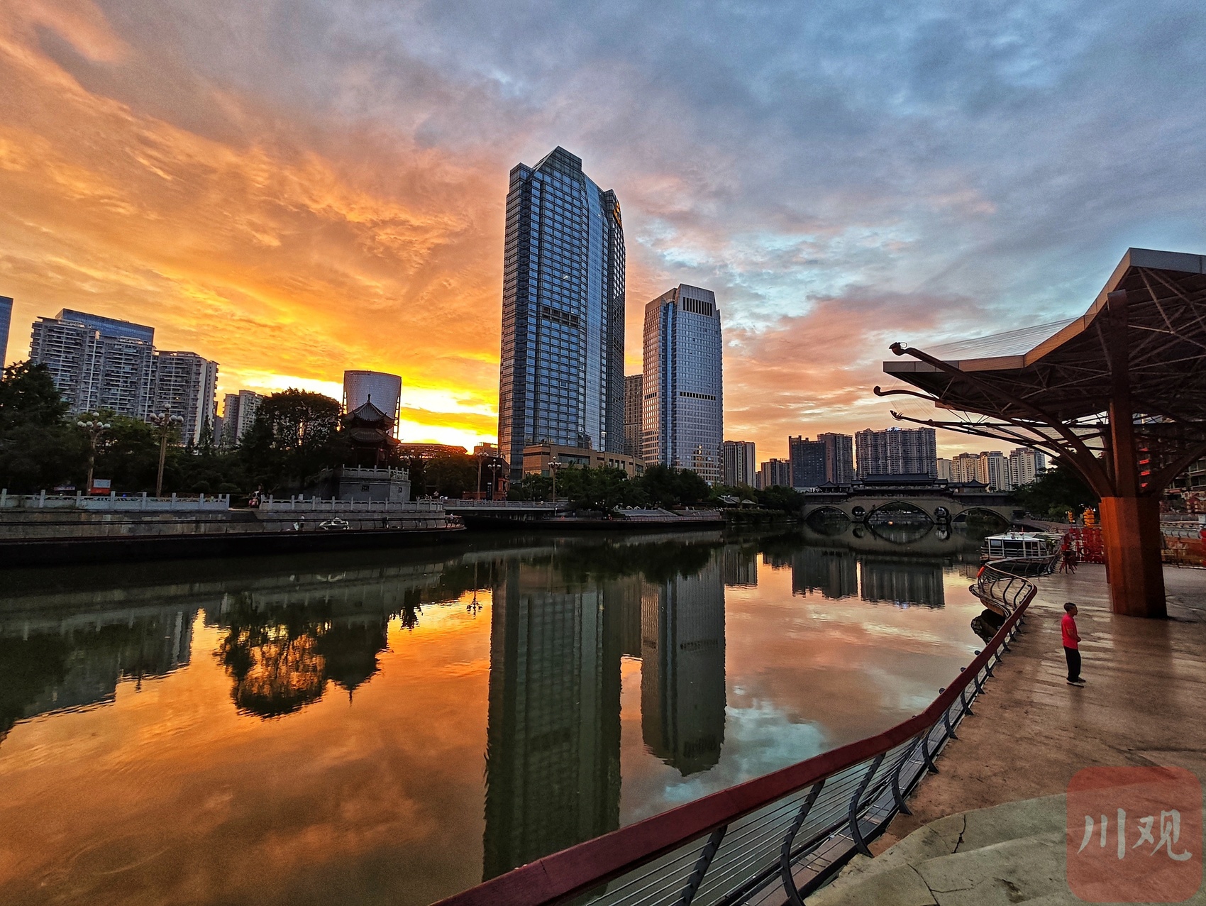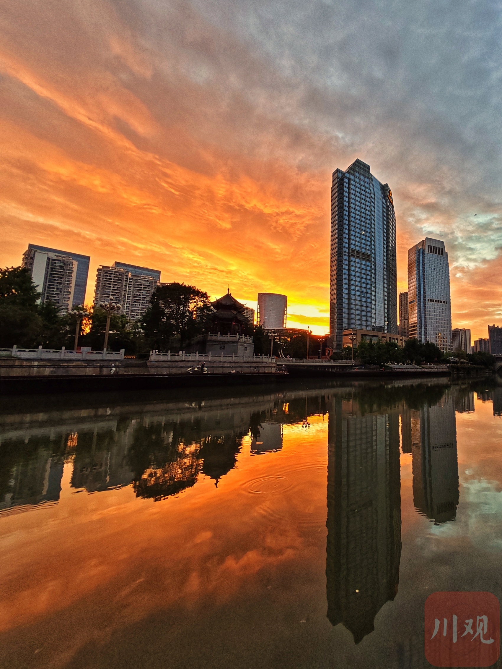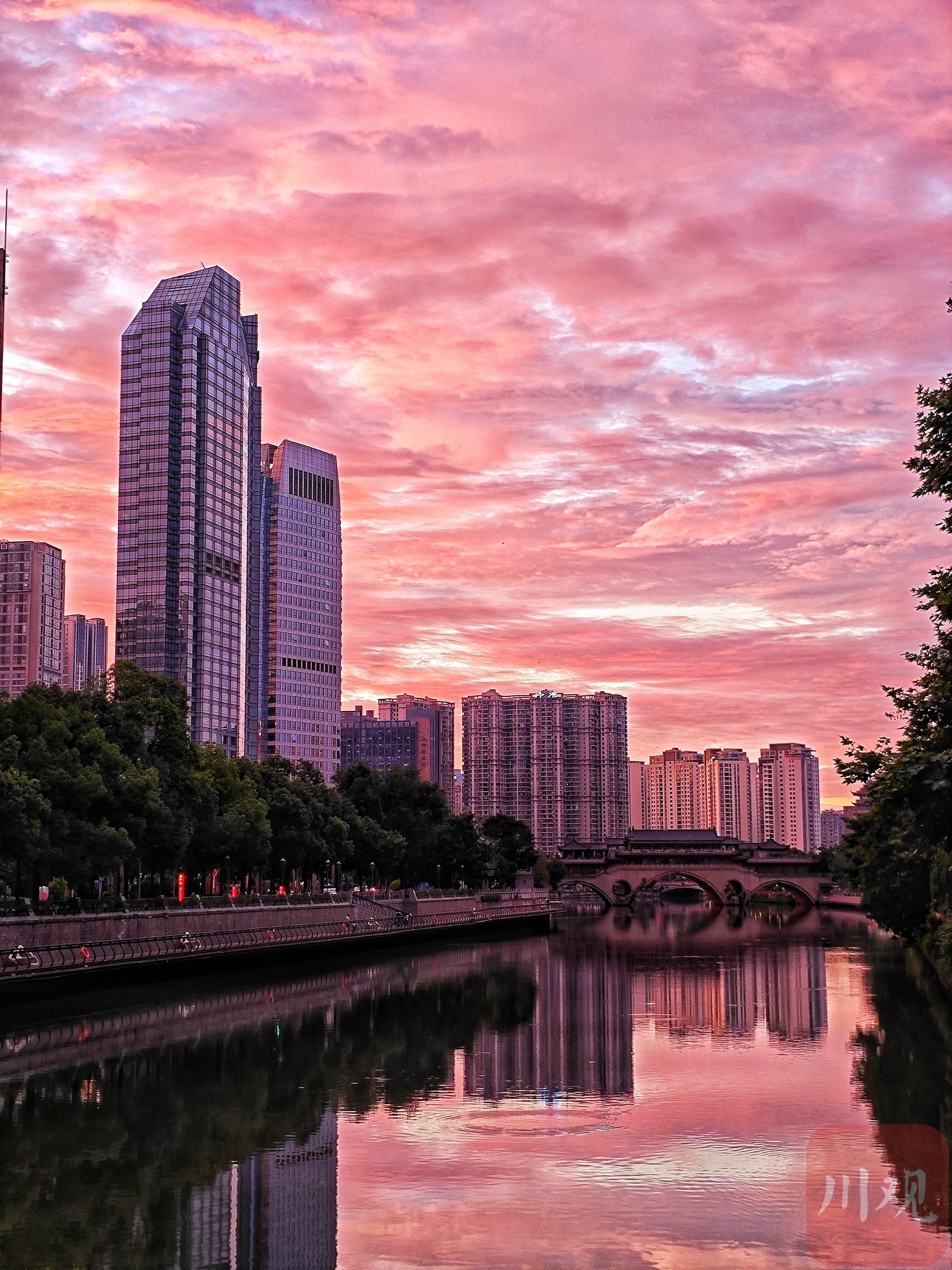 6月17日清晨,成都市区天空出现火烧云。在绚丽云彩的映照下,市区仿佛进入童话世界。