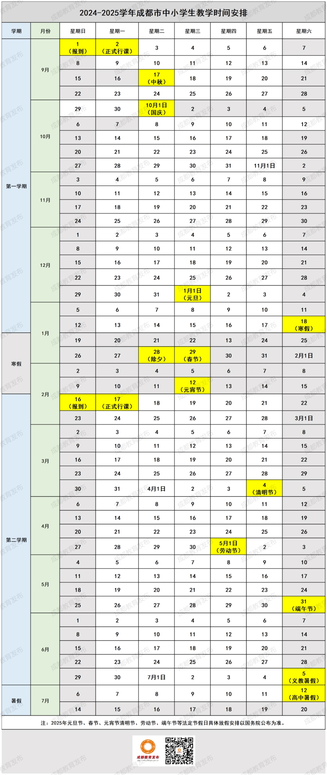 2024-2025学年度第二学期:2025年2月16日办理入学手续,2月17日正式行课,7月4日结束,7月5日开始放暑假,实际教育教学共计20周。