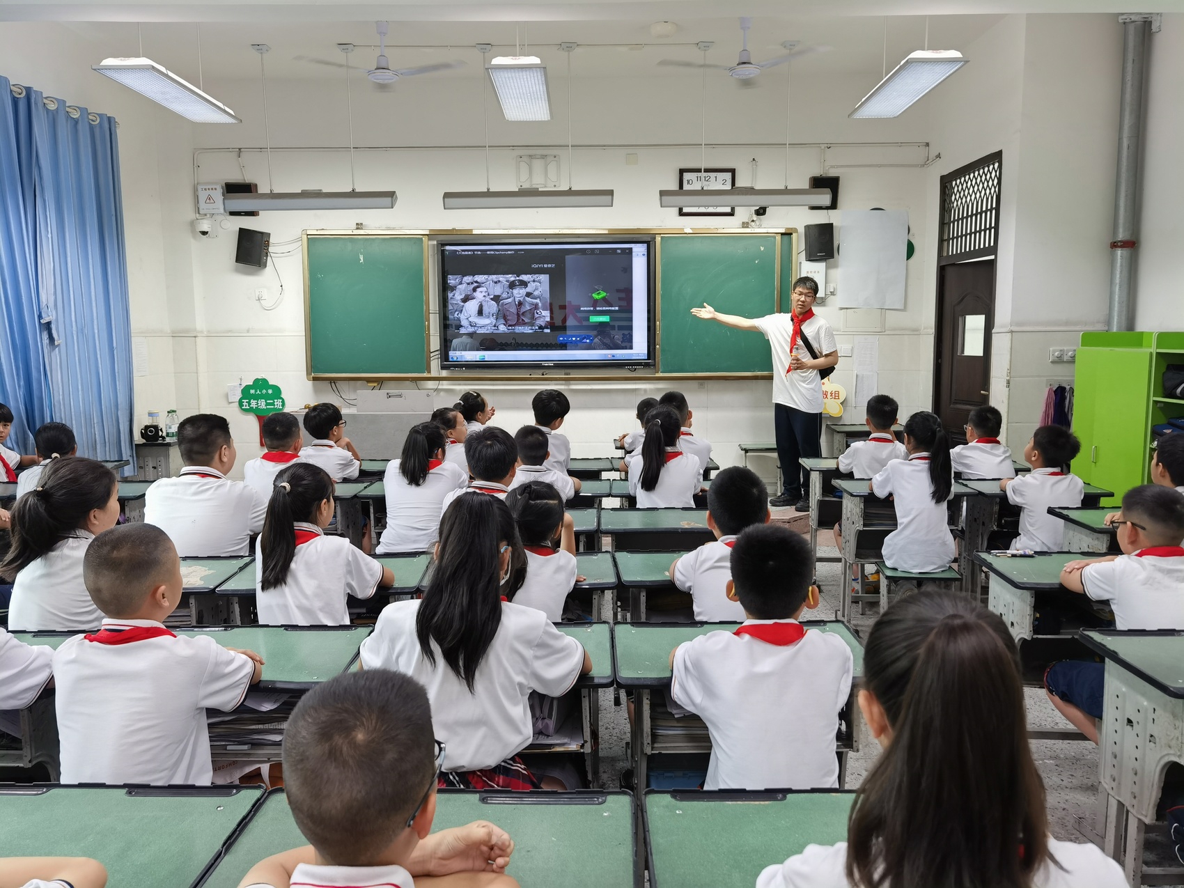 在树人小学隆重的欢迎仪式结束后,来自树人小学的同学们为北京第十二中学师生们佩戴红领巾,并结队手牵手走进课堂。