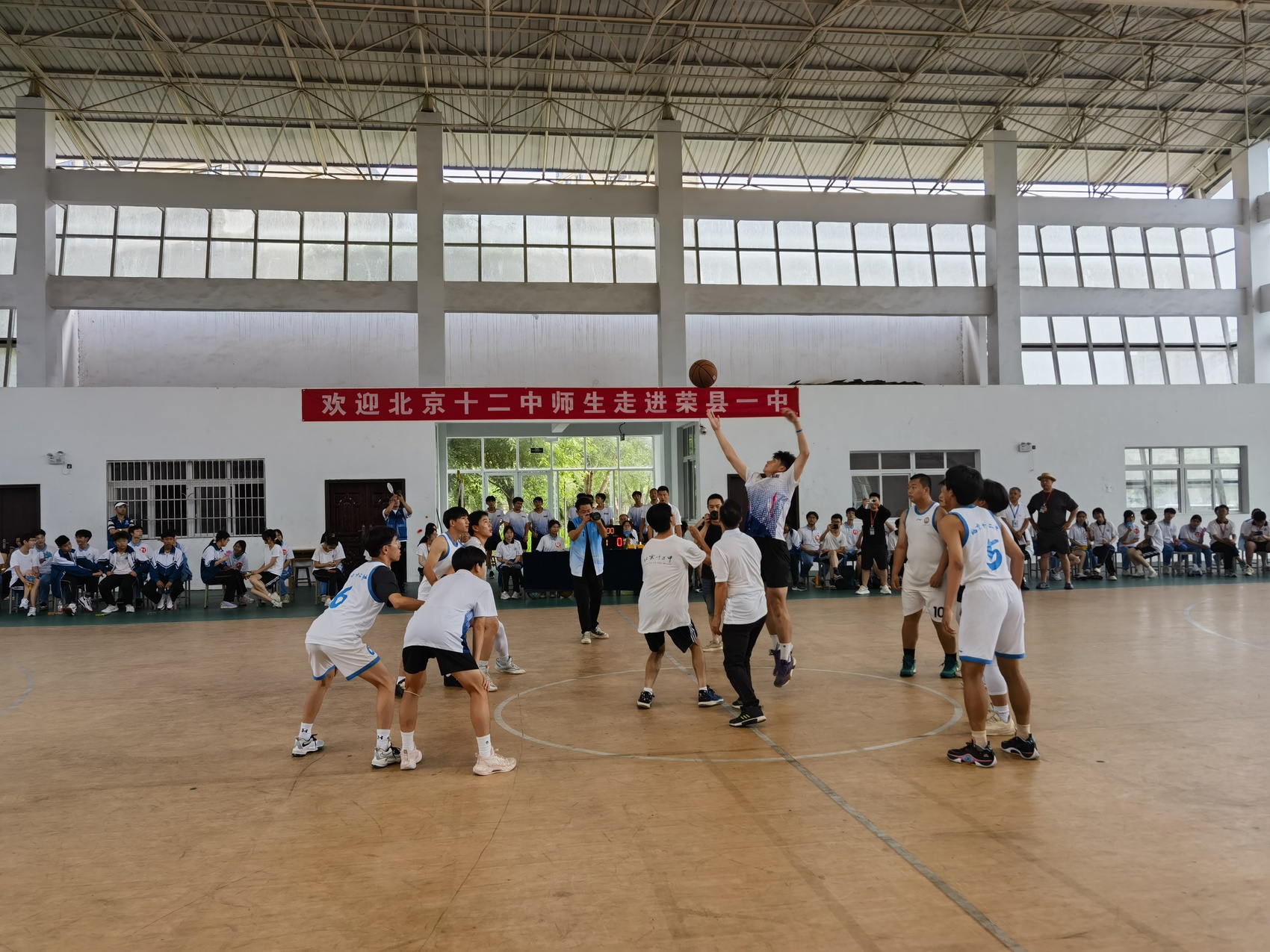 在荣县一中,师生们列队欢迎远道而来的朋友,随后,由两校同学组成的篮球队举行了一场精彩的友谊比赛。赛场上气氛热烈,同学们热血沸腾,为两支球队的每一个精彩表现欢呼鼓掌。比赛结束后,在场领导为获得篮球友谊赛优秀奖、最有魅力球员奖的球员颁奖。