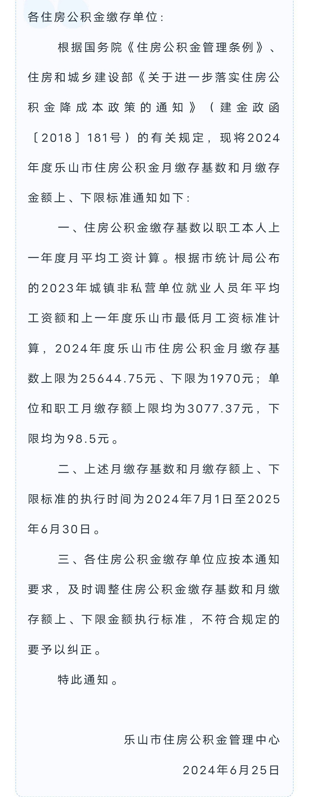 日前,乐山市住房公积金中心公布《2024年度住房公积金月缴存基数和月缴存额上下限标准的通知》(以下简称“通知”),规定了乐山公积金今年缴存基数的上限和下限,该标准将于7月1日起实行。