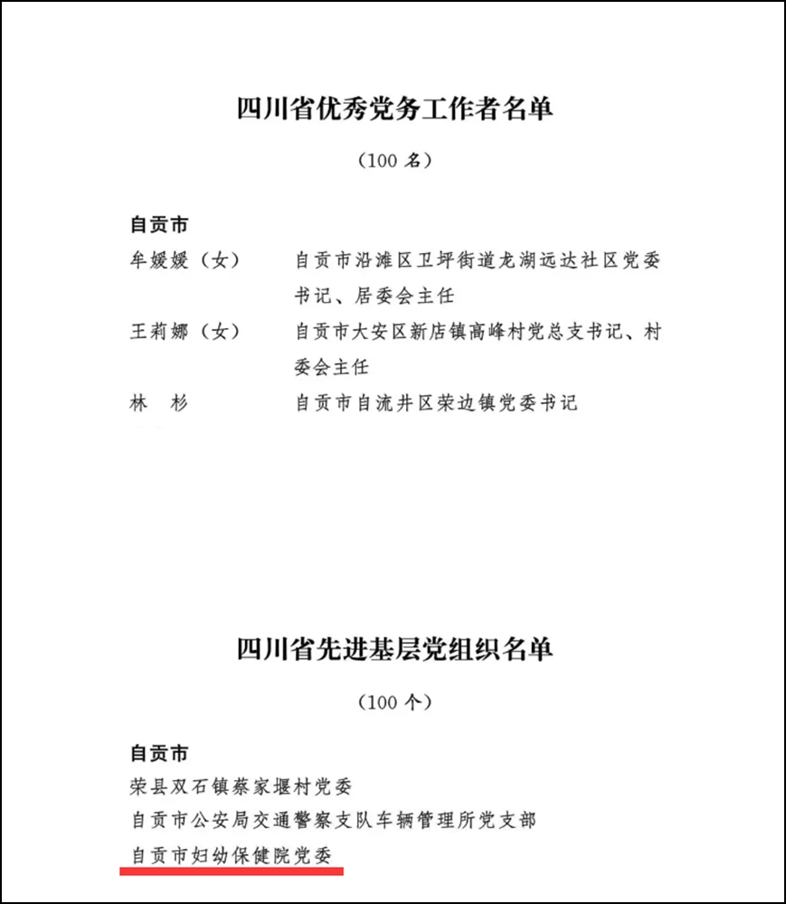 7月1日,在庆祝中国共产党成立103周年之际,自贡市妇幼保健院被中共四川省委授予“四川省先进基层党组织”荣誉称号。