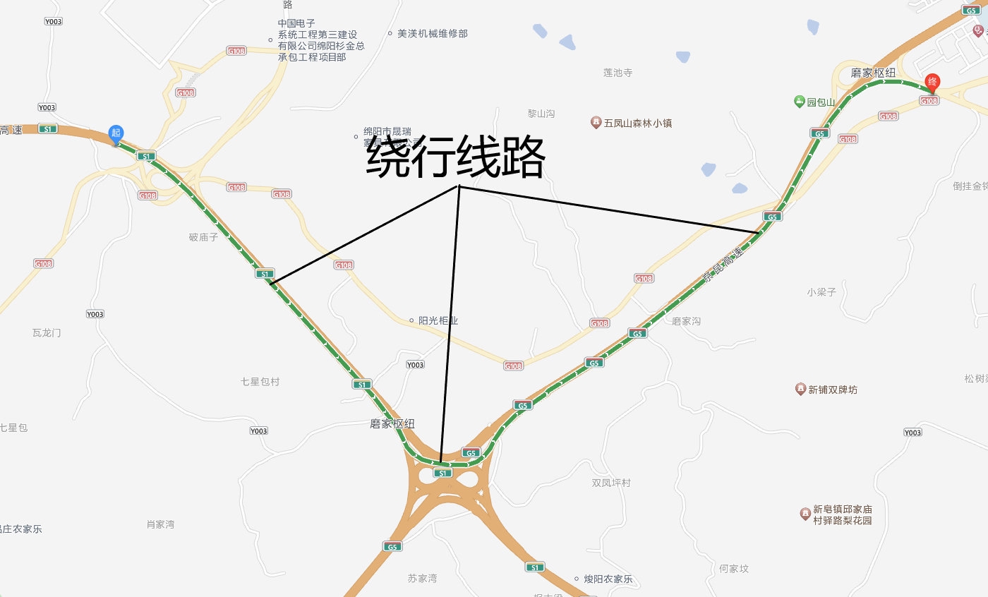 1、封闭成绵向高新区收费站下行匝道:经高新区收费站下站车辆行驶至S1成万高速磨家互通枢纽-—G5京昆高速—绵阳南收费站下站绕行,绕行路线如图: