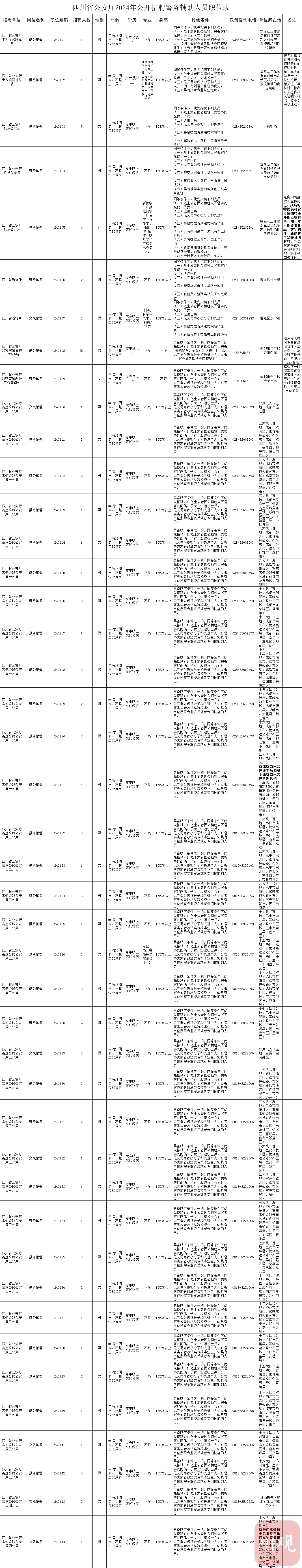 四川省公安厅计划招聘186名辅警,其中出入境管理总队2名、机场公安局26名、省看守所4名、交警总队高速公路各支队94名、留置看护工作管理处60名。具体的岗位名额、资格条件等详见《四川省公安厅2024年公开招聘警务辅助人员职位表》。