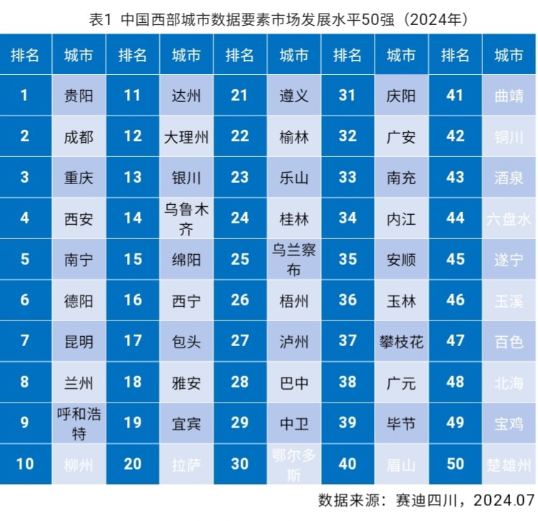 7月9日,赛迪工业和信息化研究院(集团)四川有限公司(以下简称“赛迪四川”)正式发布了《中国西部城市数据要素市场发展水平评估报告(2024年)》,并根据本报告评估模型对我国西部地区131座城市数据要素市场发展水平进行了评估,最终形成50强榜单(结果见表1)。