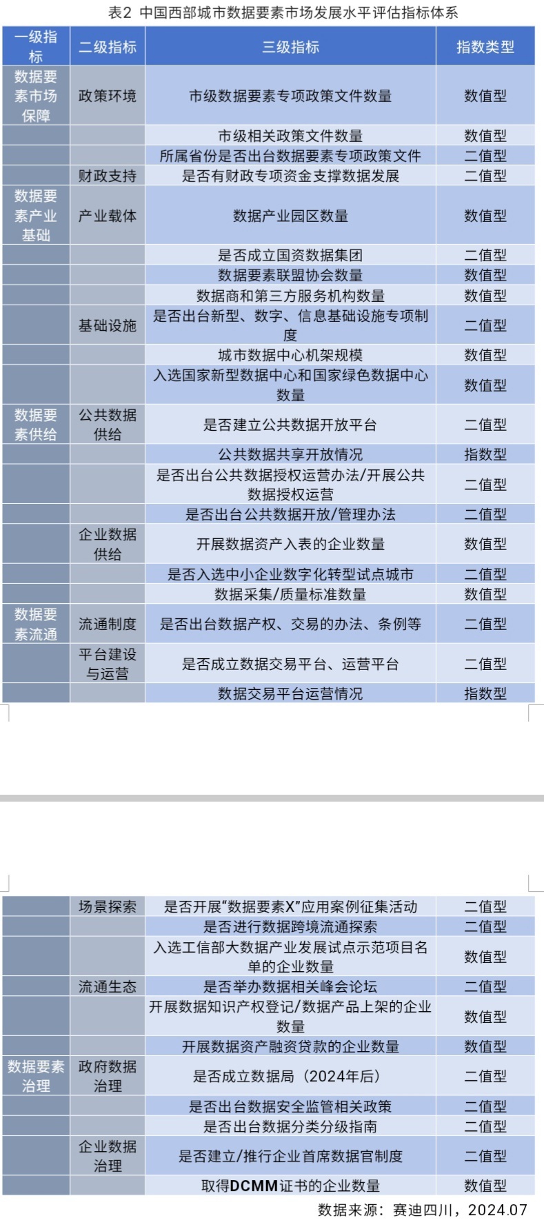 《中国西部城市数据要素市场发展水平评估报告(2024年)》在2023年中国城市数据要素市场发展评估指标体系基础上,对指标进行了修改和补充完善,增加了是否成立国资数据集团、开展数据资产入表的企业数量、数据采集/质量标准数量、是否成立数据局(2024年后)等指标。