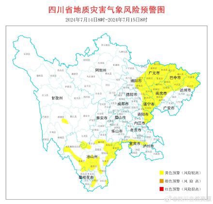 四川将迎新一轮强降雨,28个县市区地灾风险较高! 根据四川省气象台天气预报情况,结合四川省地质环境条件,7月14日8时至7月15日8时,全省地质灾害气象风险预警结果如下: