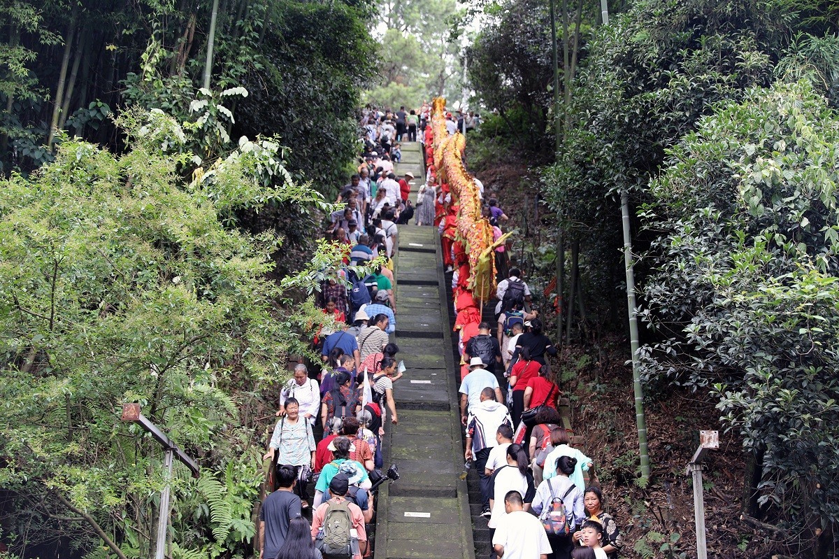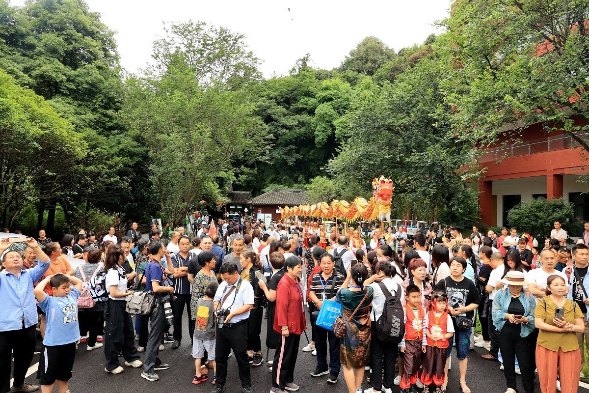 当天的朝山会活动从老峨山山门到金顶沿途都布置了丰富多彩的文化活动,不仅有唢呐、舞龙等丹棱非物质文化遗产展示,还有书法、汉服等传统文化展示,也有“佛法供天”“青龙归来”等主题祈福仪式,而更让游客惊喜的是福墙集百福、开福气盲盒、DJ互动等活动,能沉浸式体验到老峨山的人文和自然之美。