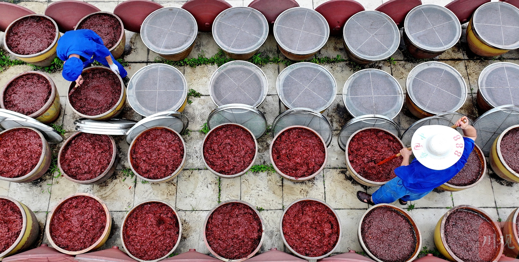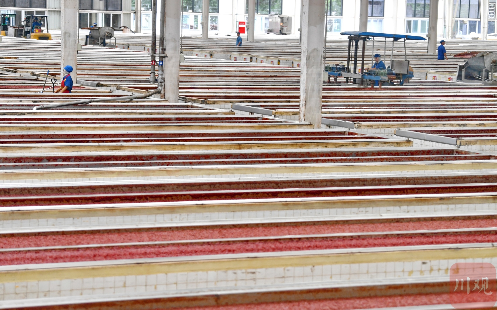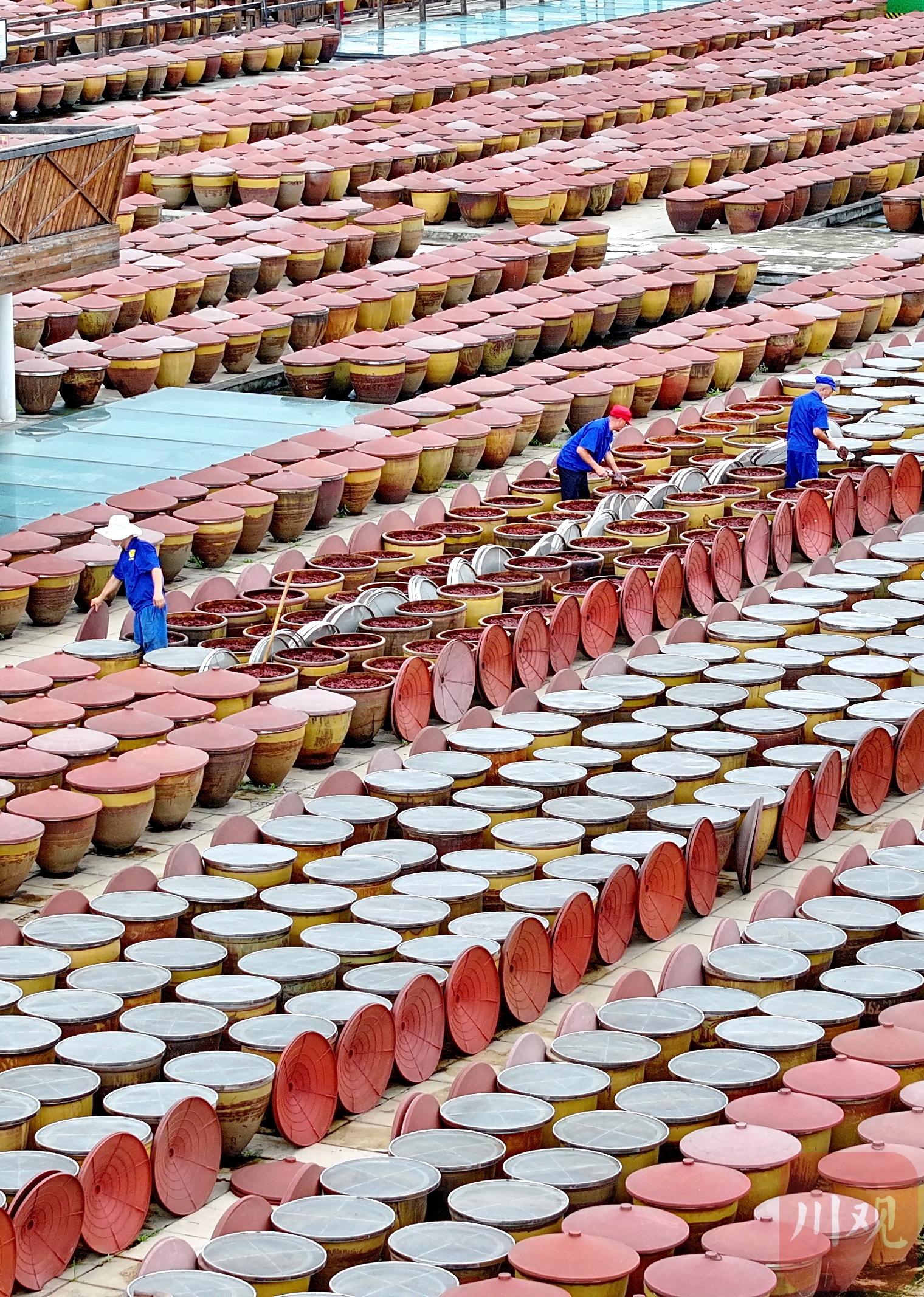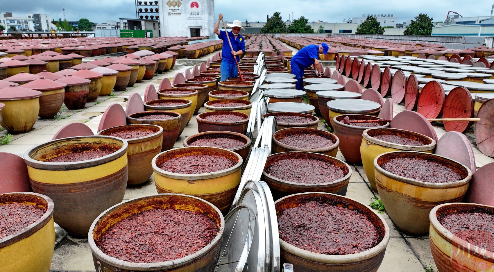 调配、罐装、包装、检验……7月15日,川观新闻记者走进位于成都市郫都区安德镇“中国川菜产业化功能园区”内四川省郫县豆瓣股份有限公司生产车间,只见装满豆瓣酱的窖池整齐排列,工人们开着翻搅机,或手拿勺子搅拌豆瓣酱,现场一片繁忙的生产景象,浓浓的香味扑面而来。