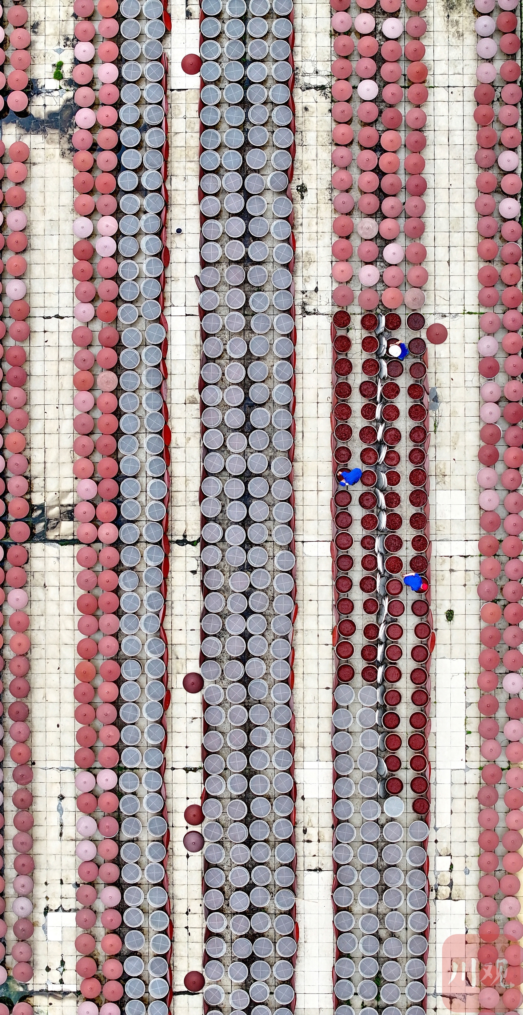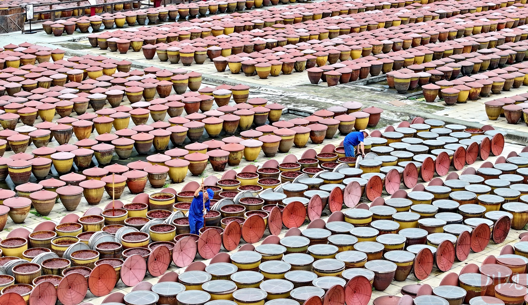在四川省郫县豆瓣股份有限公司晾晒区,工作人员正在搅拌豆瓣酱。