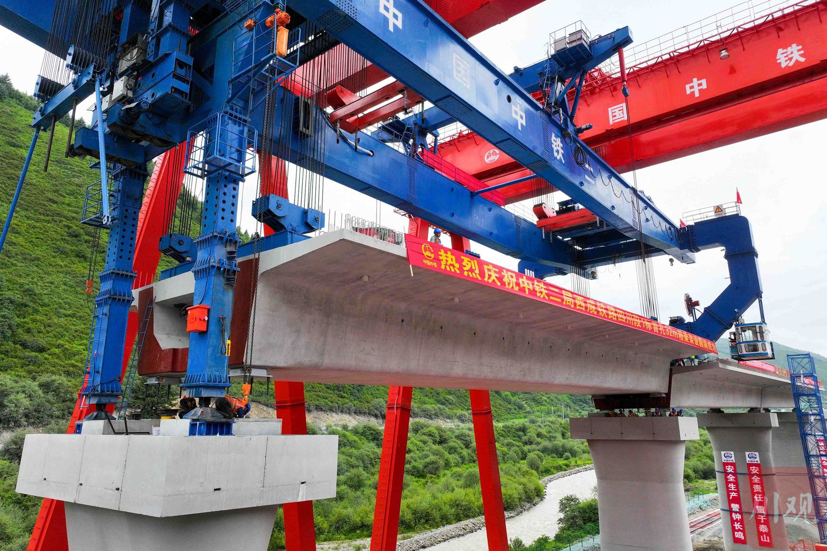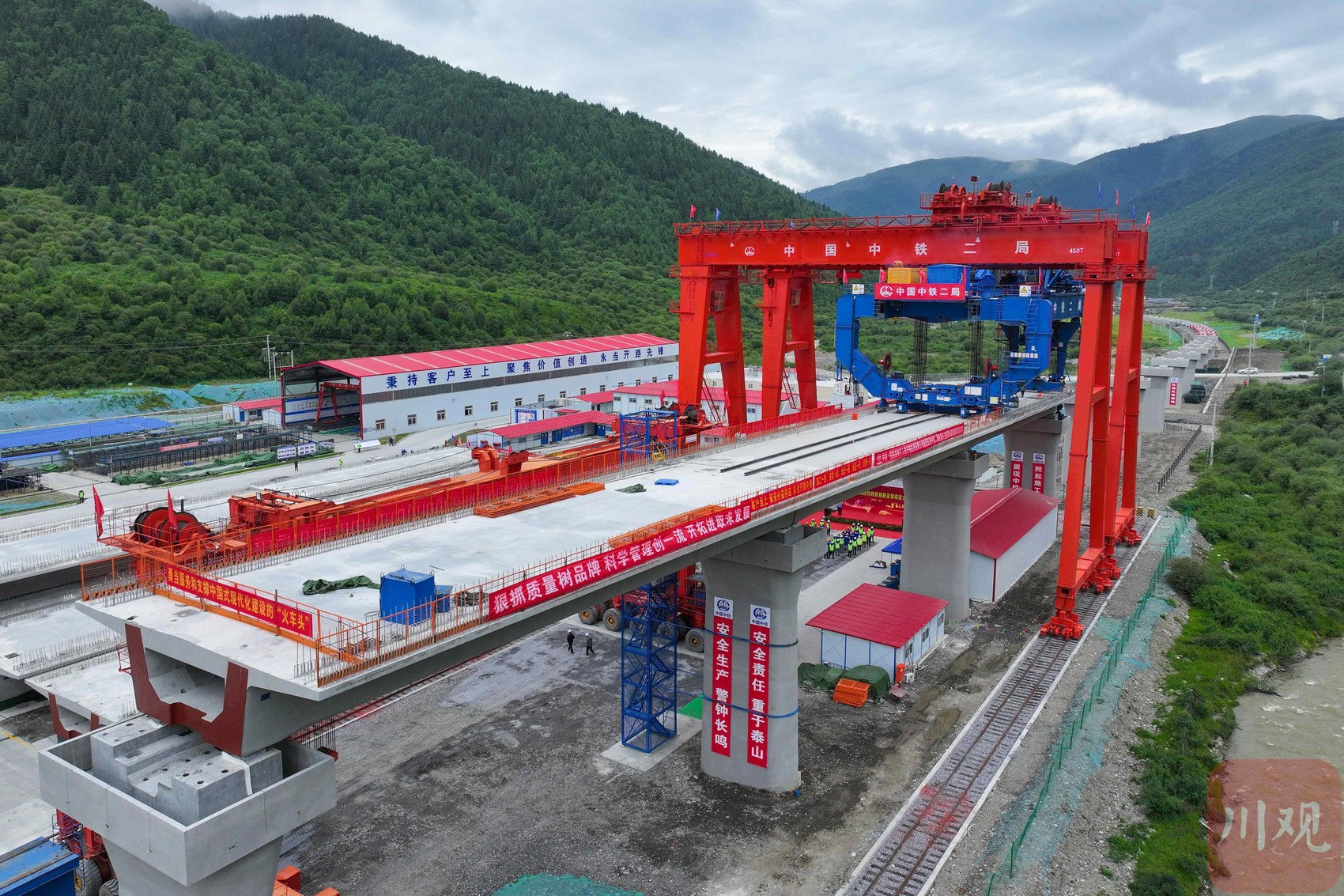 据成兰铁路公司西宁至成都铁路指挥部指挥长印建文介绍,新建西宁至成都铁路四川段从开建以来建设有序推进,四川段14座隧道已完成开挖支护10公里,62座桥梁完成桩基16123根、占比99.2%,完成墩台身1010个,箱梁预制完成224片。今日首孔箱梁的成功架设也标志着西宁至成都铁路四川段铁路桥梁示范段建设已有序展开,为后续的桥梁施工起到“样板引路”示范引领作用。