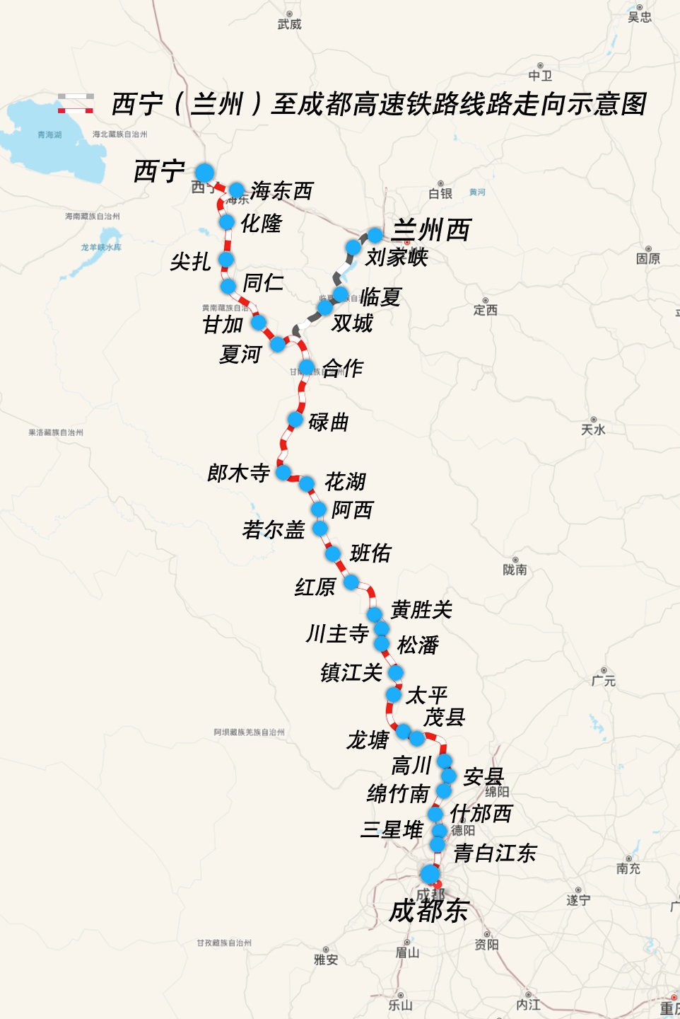 西宁至成都铁路是我国“八纵八横”高铁网兰州、西宁至广州的兰(西)广通道的组成部分,起自青海省西宁市西宁站,经青海省海东市、黄南藏族自治州,甘肃省甘南藏族自治州,四川省阿坝藏族羌族自治州,接入四川省成都市成都东站。新建西宁至成都铁路四川段由川青铁路黄胜关站引出,途经红原、班佑、若尔盖、阿西、花湖和郎木寺等站进入甘肃省境内,长约170公里,设计时速200公里,部分路段预留提速至时速250公里条件, 于2022年正式开建,建设工期7.5年。