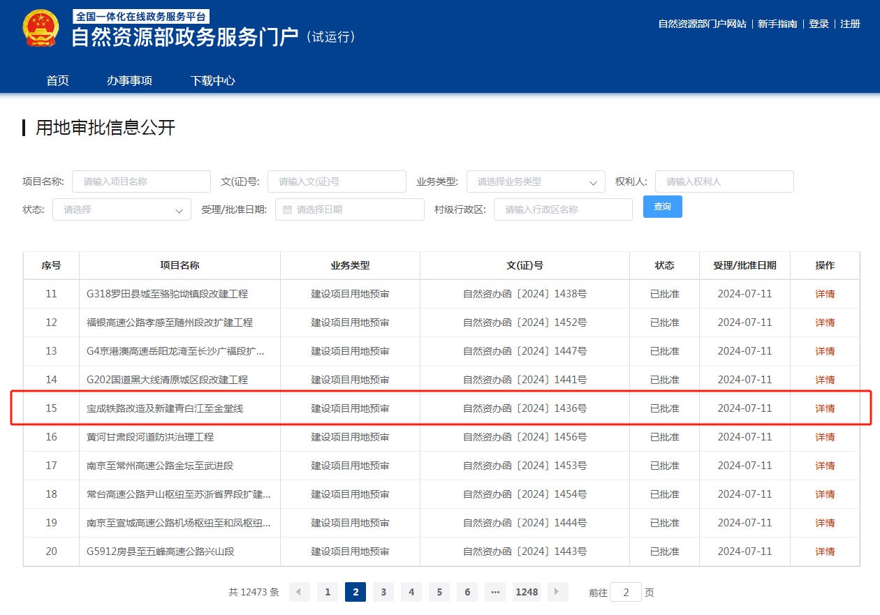 近日,宝成铁路改造及新建青白江至金堂线项目前期工作取得重大进展,项目用地预审正式获得自然资源部批准,为项目可研批复和尽早开工建设奠定扎实基础。