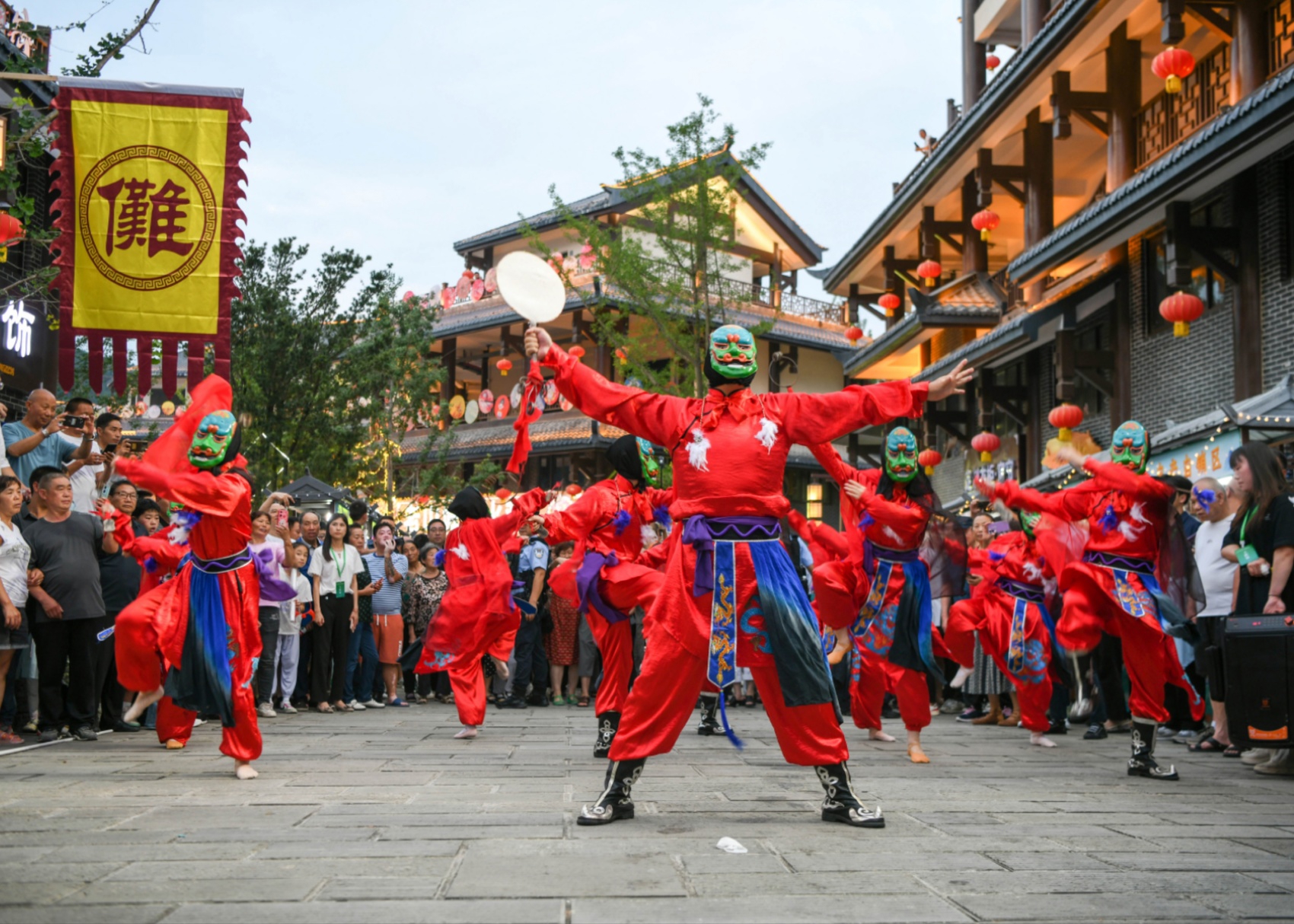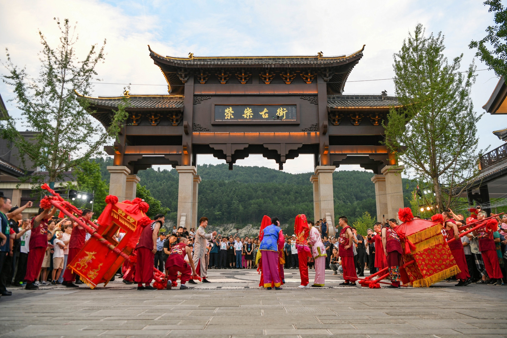 在荣乐古街上,非遗表演《高山耍狮》《川北婚嫁》独具特色,川北山歌《甘蓝土豆香又香》《妹打核桃哥帮忙》独具风情……沉浸式的民俗文化示范展示活动,吸引大量游客观看。