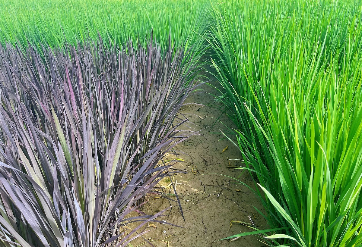 五彩稻株(左)与普通稻株对比(郭超英摄)