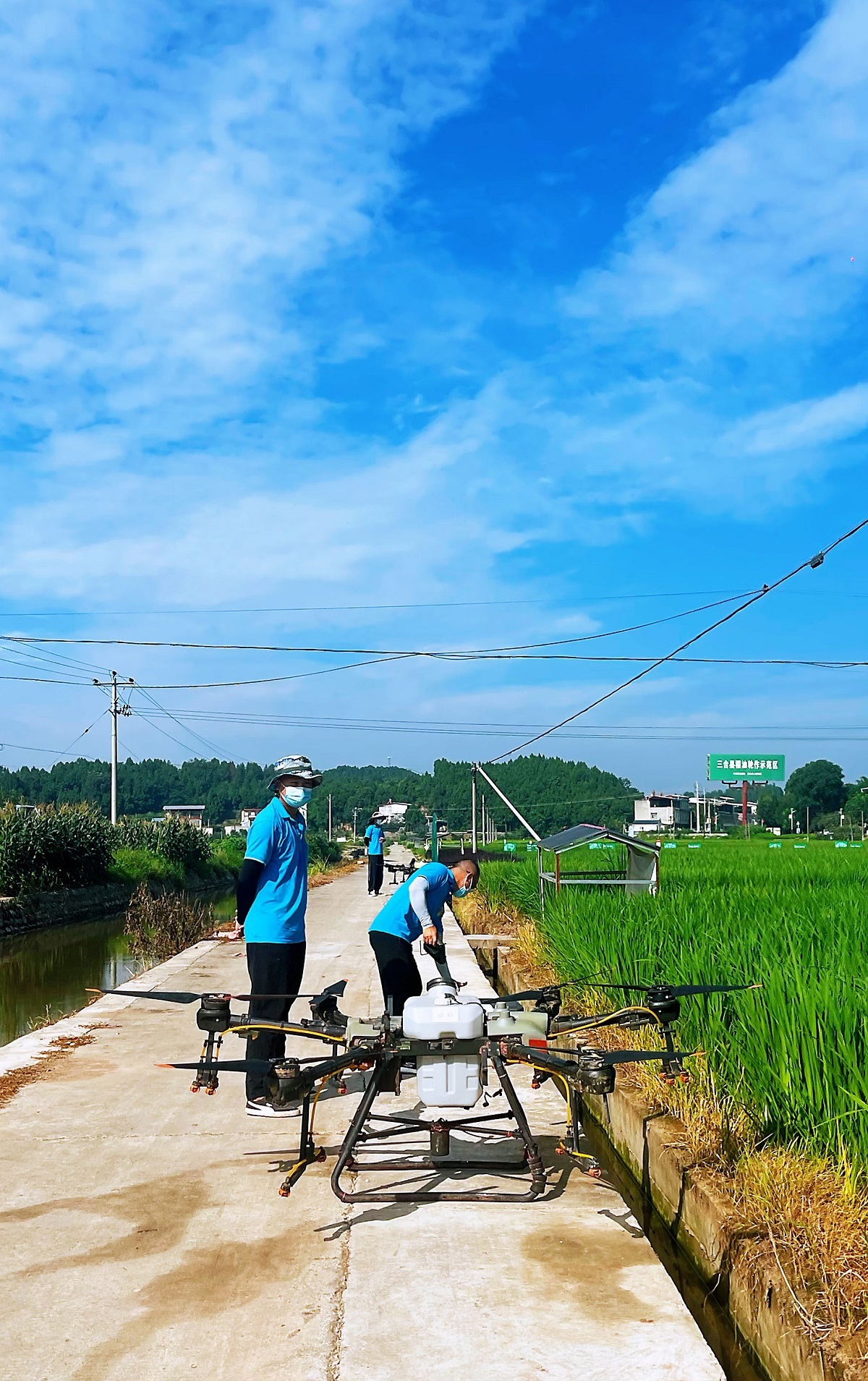 飞手正准备无人机为稻田喷洒农药(郭超英摄)