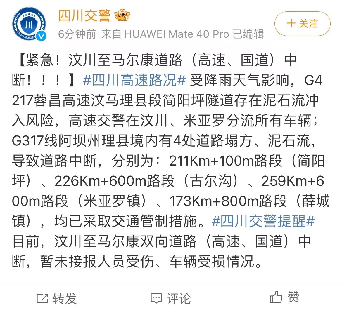 8月4日凌晨,记者从四川省公安厅交警总队获悉,受降雨天气影响,G4217蓉昌高速汶马理县段简阳坪隧道存在泥石流冲入风险,高速交警在汶川、米亚罗分流所有车辆;G317线阿坝州理县境内有4处道路塌方、泥石流,导致道路中断,分别为:211Km+100m路段(简阳坪)、226Km+600m路段(古尔沟)、259Km+600m路段(米亚罗镇)、173Km+800m路段(薛城镇),均已采取交通管制措施。