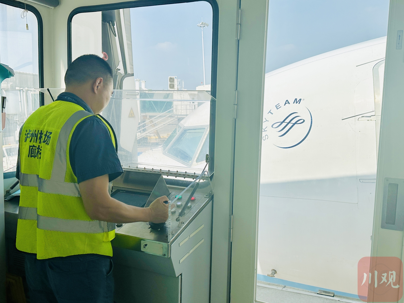 当前泸州云龙机场正值暑运模式,平均一天起飞降落70架次,这也意味着和王俊剑一样的“廊桥对接员”要开展近70次对接和撤离操作。“我们每一天早上5点就要检查机场所有的廊桥设备,做好航前准备,晚上工作至最后一个航班结束,为旅客出行提供最大的便利。”王俊剑说道。