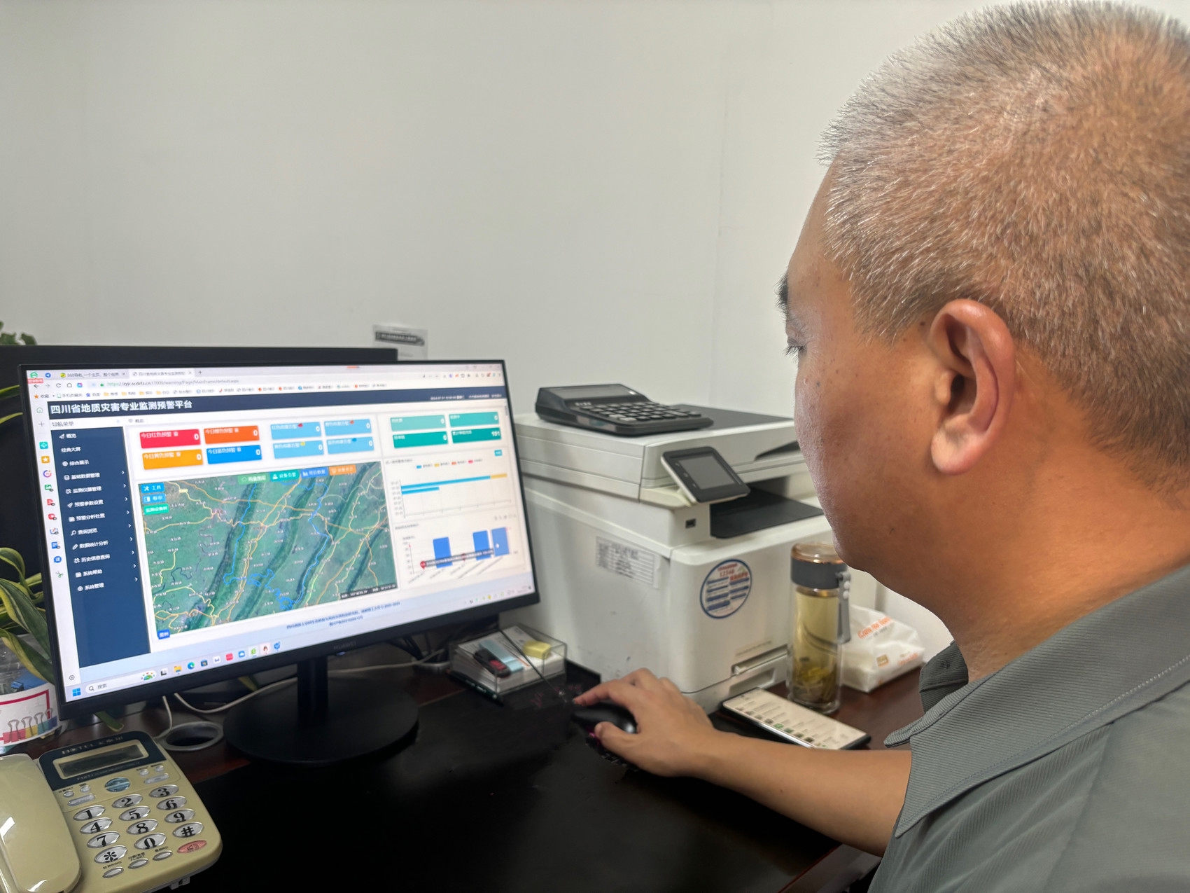 林辉荣查看四川省地质灾害专业监测预警平台数据。