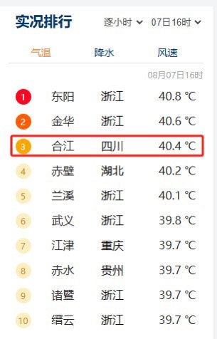 8月7日,从中国天气网气温实况排行可以看到,下午4点,合江县以40.4℃的“成绩”,登上全国高温榜三。