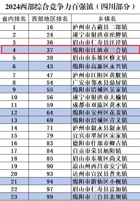 近日,“2024乡镇高质量发展交流会”在湖南长沙县黄花镇召开,会上揭晓了《2024中国西部地区综合竞争力百强镇》名单,其中,绵阳江油市三合镇位列西部地区综合竞争力百强镇第37位,四川省第4位。