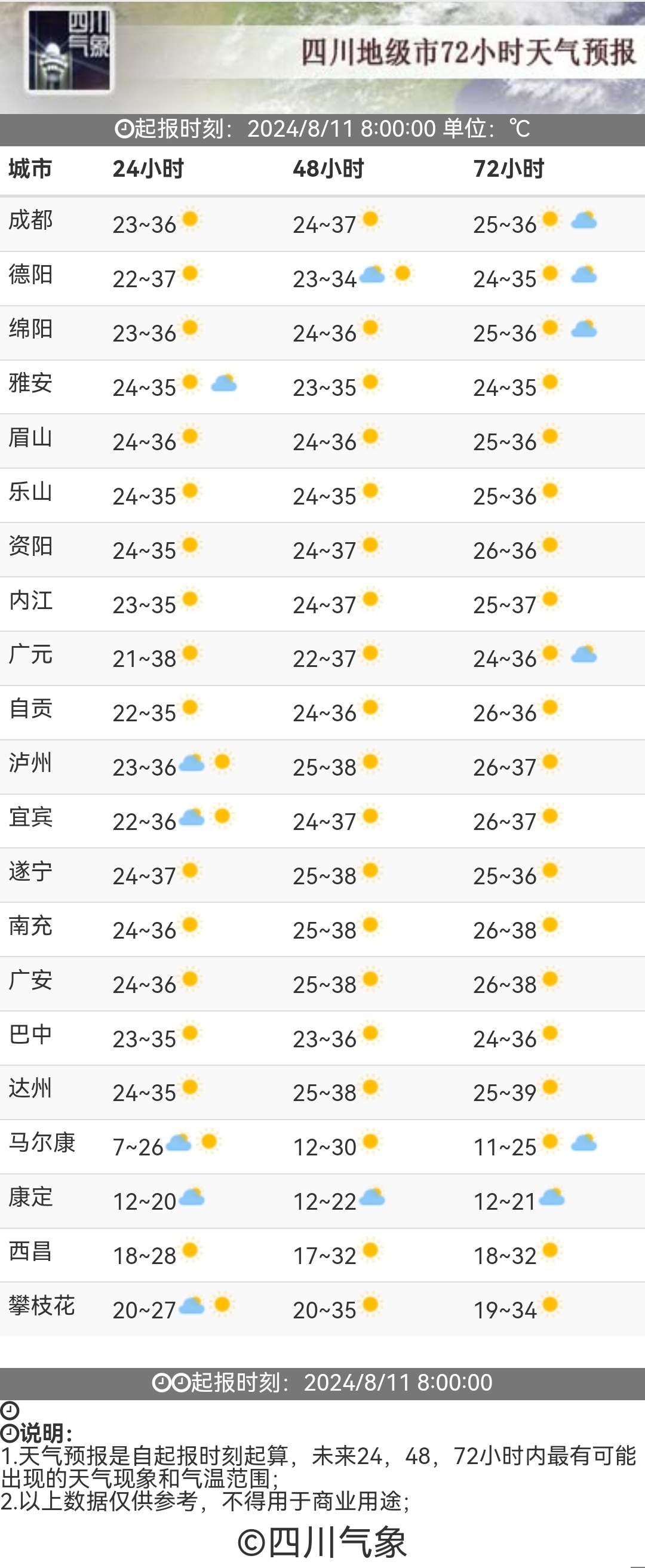 在昨天难得的清凉天气中,四川省气象台于8月10日15时50分发布了一条高温蓝色预警:8月10日20时到14日20时,盆地大部日最高气温可达35—37℃,局部38℃或以上。