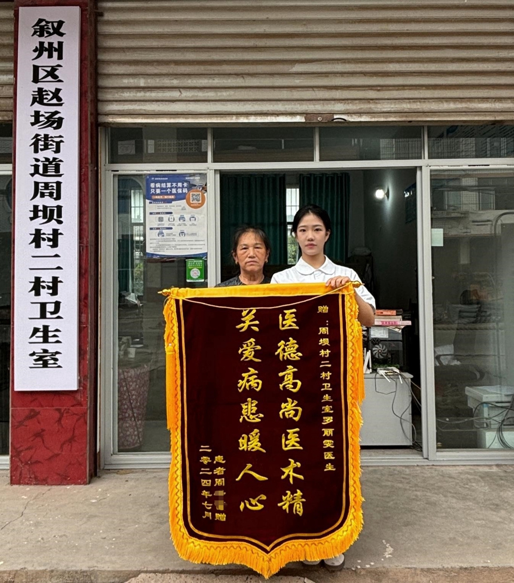 为表达感激之情,周婆婆送来一面锦旗,上面写着“医德高尚医术精 关爱病患暖人心”。“我每天都会打电话提醒她按时治疗,周婆婆觉得我很‘暖’,对她很上心,自然就愿意配合。”这是罗丽雯人生中第一次收到锦旗,这让她更加坚定了扎根基层、服务乡亲的信念。