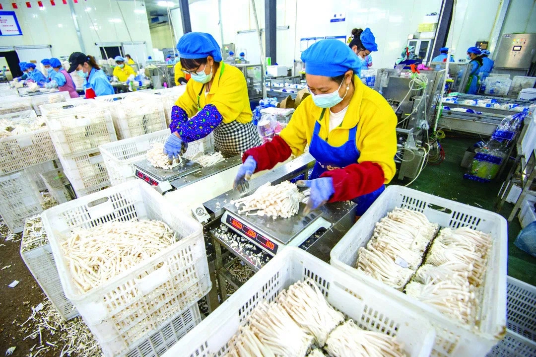 在四川芊菇生物科技有限公司,工人们正忙着称重包装海鲜菇。