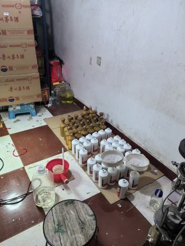 顺着线索方向,专案组再次对案件进行深挖,很快又发现一个专门生产假“茅台”酒的窝点,并于7月9日将其捣毁,成功抓获犯罪嫌疑人秦某甲、秦某乙,查获假冒伪劣“茅台”酒28瓶、基酒200余斤,总价值60余万元。