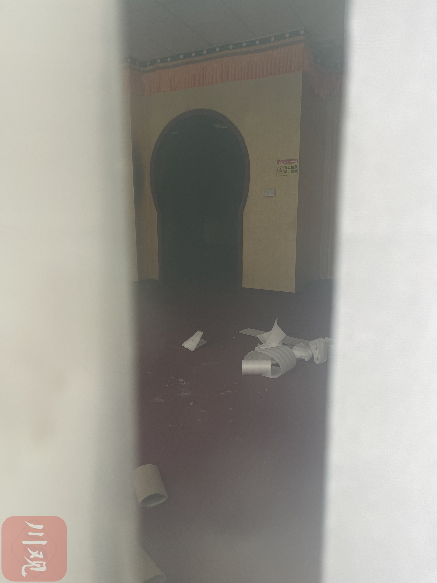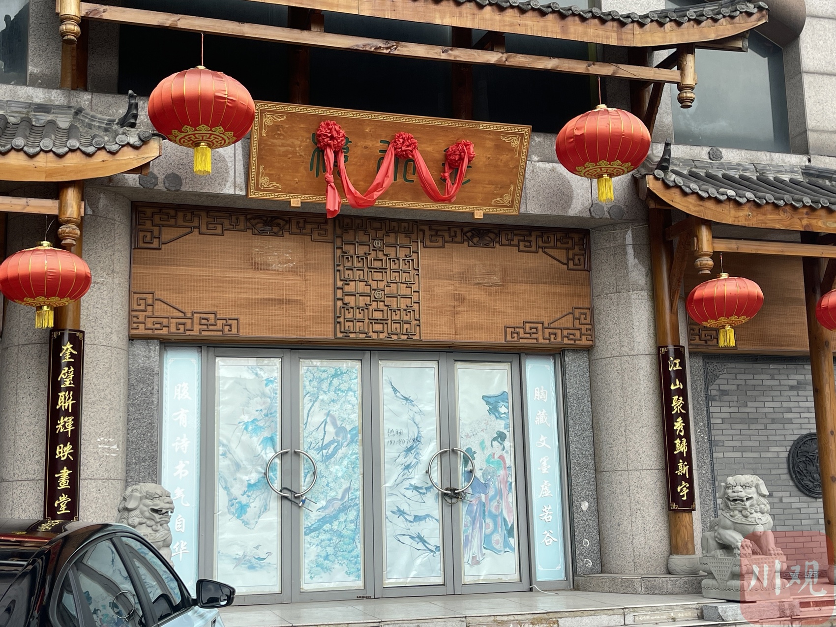 下午3时30分,华海大厦一楼大门上锁关闭。门上贴有仕女图、花鸟图等印制图纸,顶部门匾写有“忍水楼”三个大字。透过玻璃向内看,已没有任何布展的踪迹。