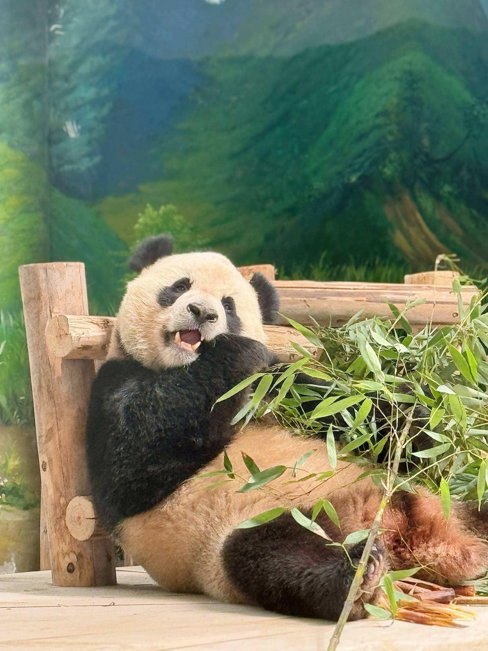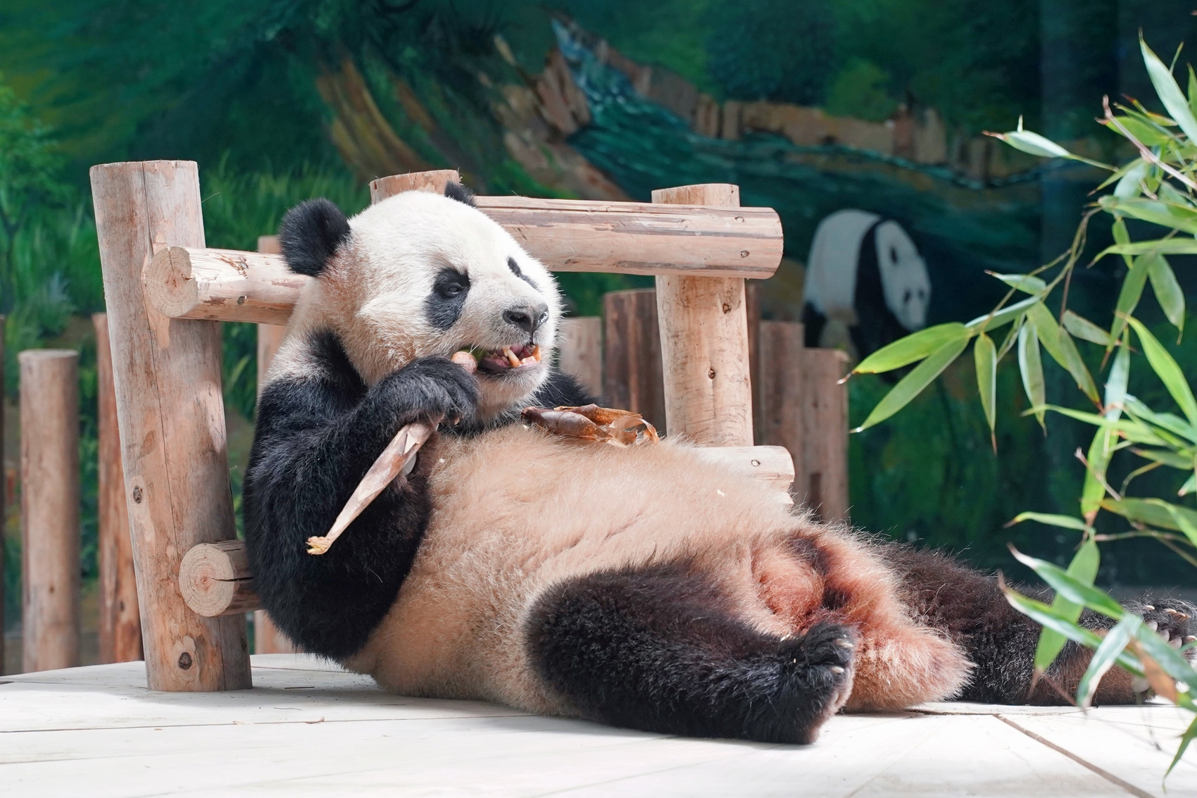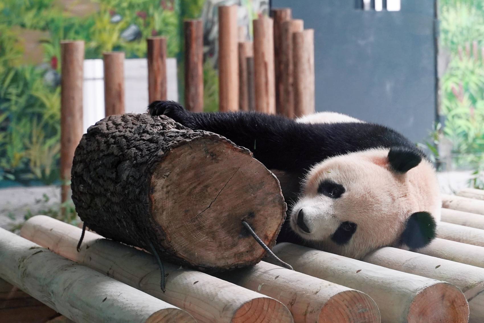 初见“林溪”时,它刚从室外回到室内,在选好一根竹枝后,便仰靠在木桩上,津津有味地吃着竹叶,而“一家”,则在它的房间呼呼大睡。