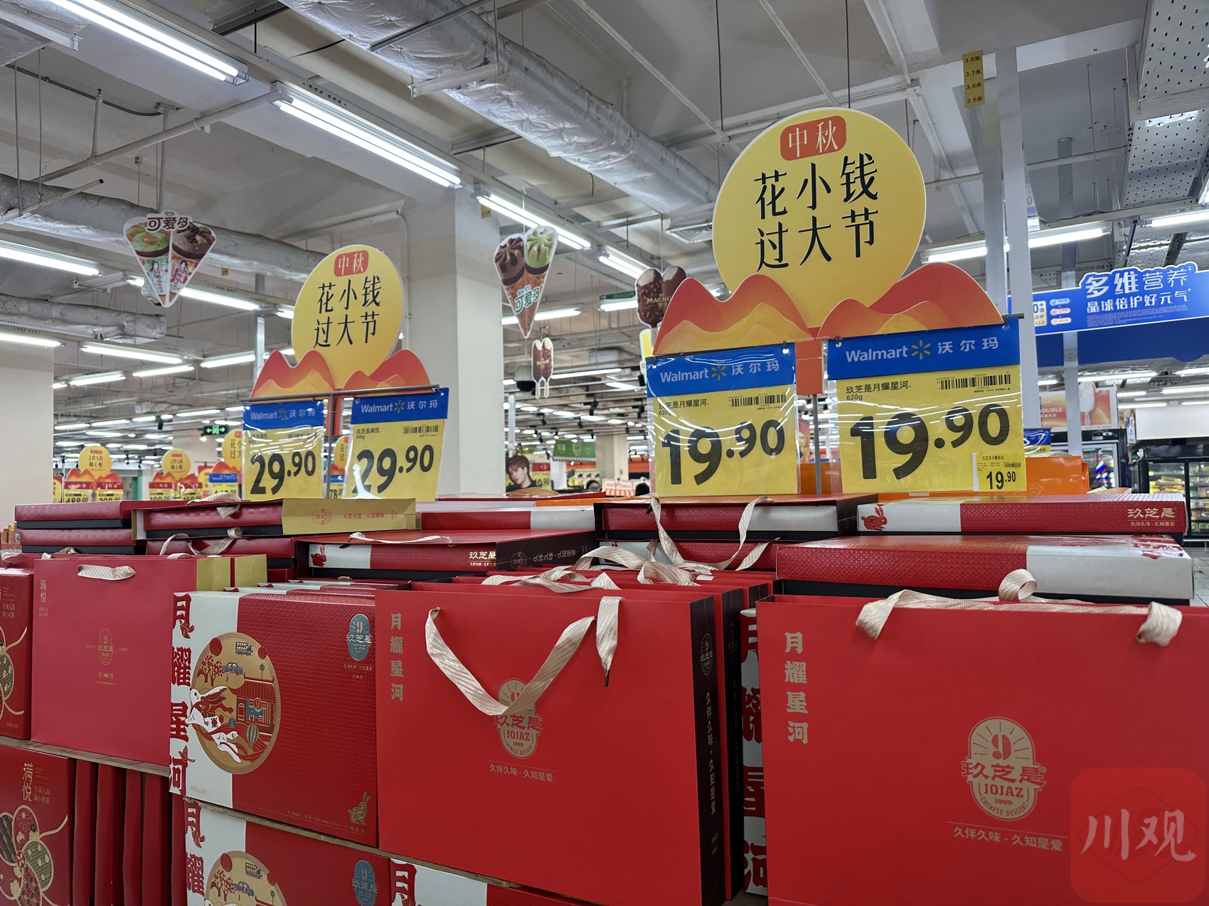 包装变“轻”了,平价礼盒也明显增多。8月26日,记者在沃尔玛北大街店看到,该店内显眼位置已摆放着各种各样的月饼,其中一款620克的礼盒装月饼仅售19.9元,还特意摆放在十分显然的位置。