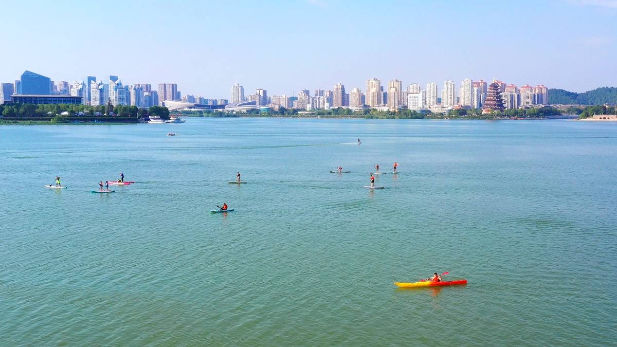 8月18日,天气晴好,一群桨板运动爱好者划行于观音湖上。8月以来,遂宁市川渝大学生(青少年)水上运动体验中心免费开放桨板及休闲皮划艇体验。每日下午4点到7点半,12岁至50岁的水上运动爱好者都可直接到场体验“中流击水,浪遏飞舟”的感觉。