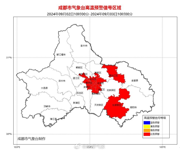 成都市气象台2024年9月2日10时00分更新高温橙色预警信号为高温红色预警信号:预计成都市武侯区、锦江区、青羊区、成华区、金牛区、高新南区、高新西区和青白江区的所有镇(街道)未来24小时内最高气温将升至37℃以上,东部新区的大部分镇(街道)未来24小时内最高气温将升至40℃以上。