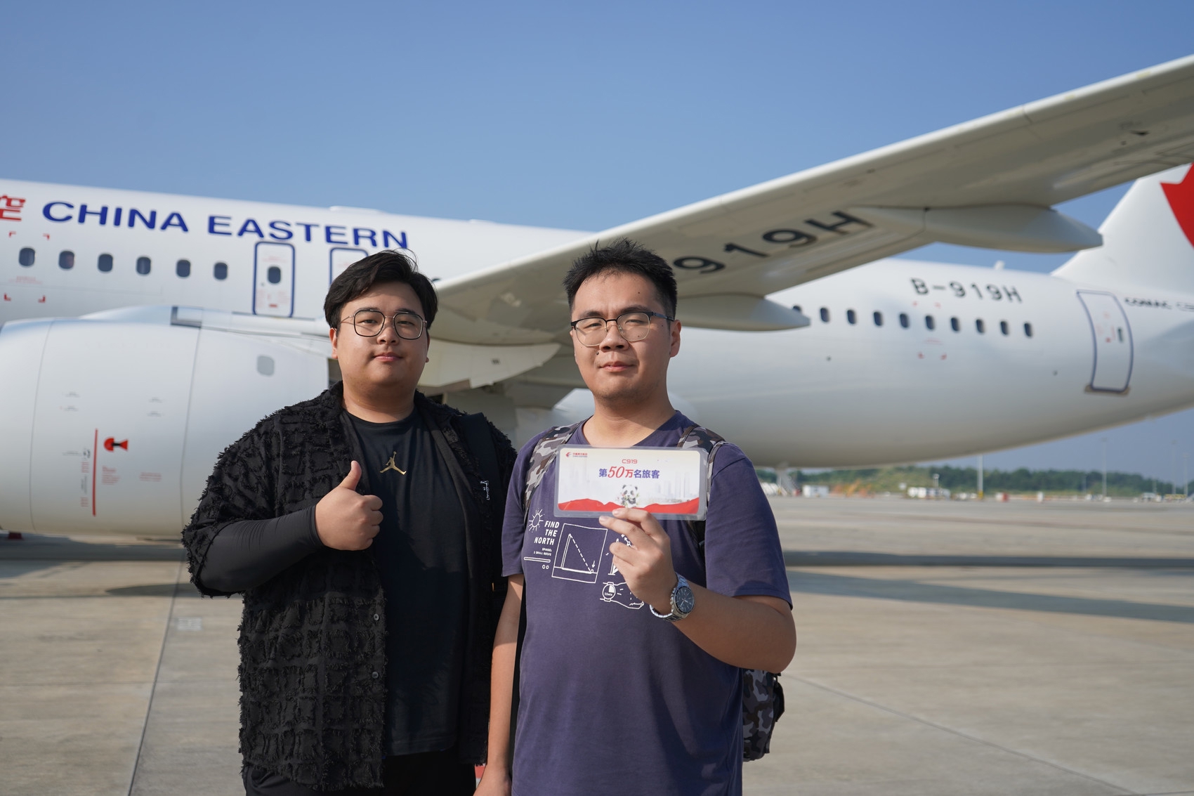 C919第50万名旅客从成都起飞(图右)。(图片由东方航空提供)