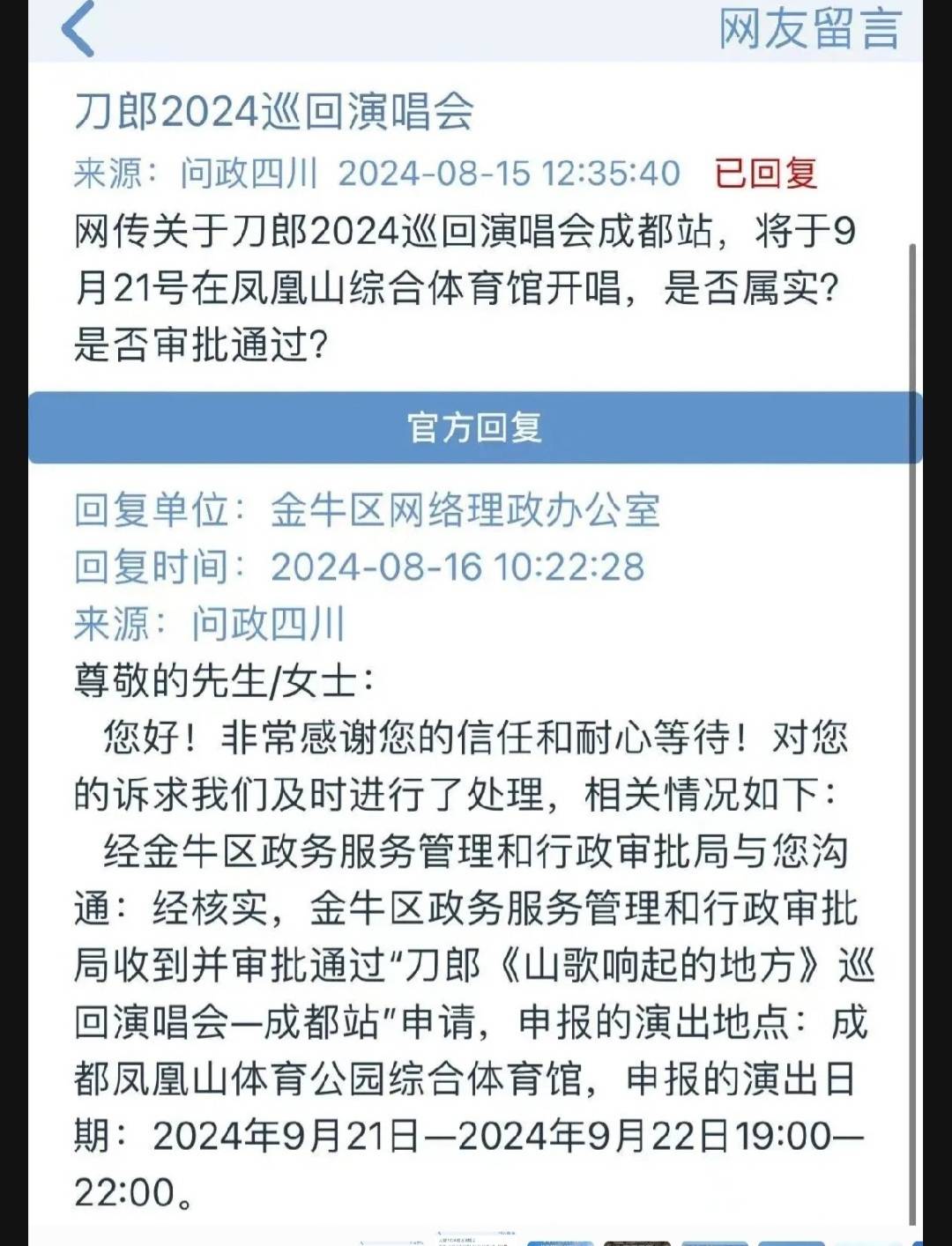 8月15日,有网友在“问政四川”平台询问,刀郎演唱会在成都凤凰山体育公园举行的消息是否属实。次日,成都金牛区网络理政办公室在回复网友咨询时表示,经核实,金牛区政务服务管理和行政审批局收到并审批通过“刀郎《山歌响起的地方》巡回演唱会—成都站”申请。该巡回演唱会成都站申报的演出地点为成都凤凰山体育公园综合体育馆,申报的演出日期为9月21日、22日19时至22时。