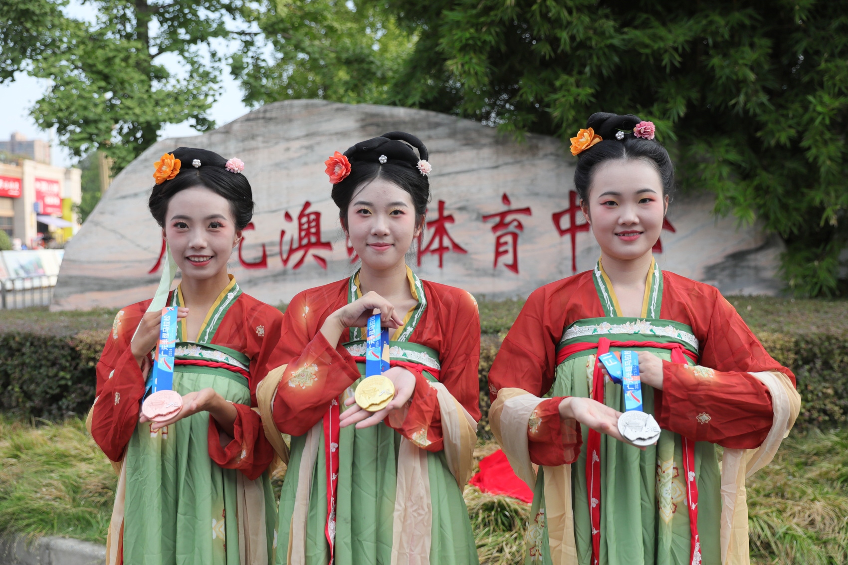 着汉服的颁奖礼仪展示半程马拉松金银铜牌。高志农 摄