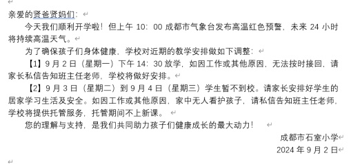 此前,8月29日,成都市气象部门下调高温橙色预警为蓝色预警,显示未来几天将逐步降温,因此全市中小学(幼儿园)秋季开学时间定为按原定计划执行。成都市教育局要求学校根据开学后天气情况,落实好防暑降温措施,高温时段应避免户外活动,学生军训工作暂缓开展,还明确学校在高温时段可结合实际采取停课停学、调整教学安排等措施,同时做好家校沟通。今日高温红色预警信号再次发布,成都市教育局立即进行了安排部署,再次明确了工作要求,各区(市)县或学校可根据实际灵活安排教学工作。